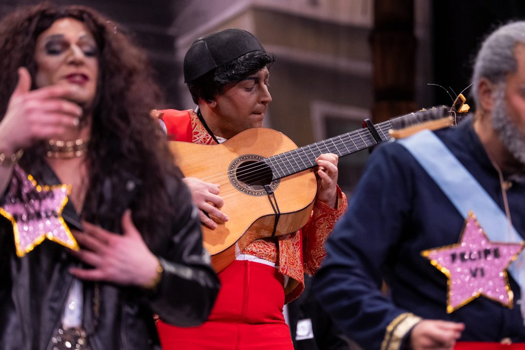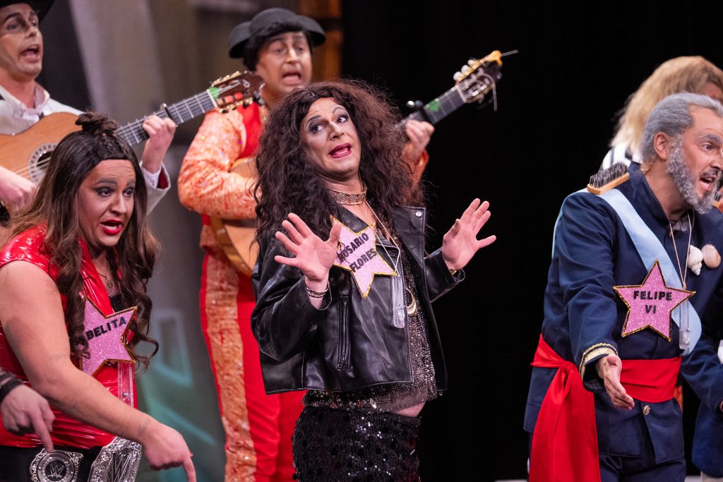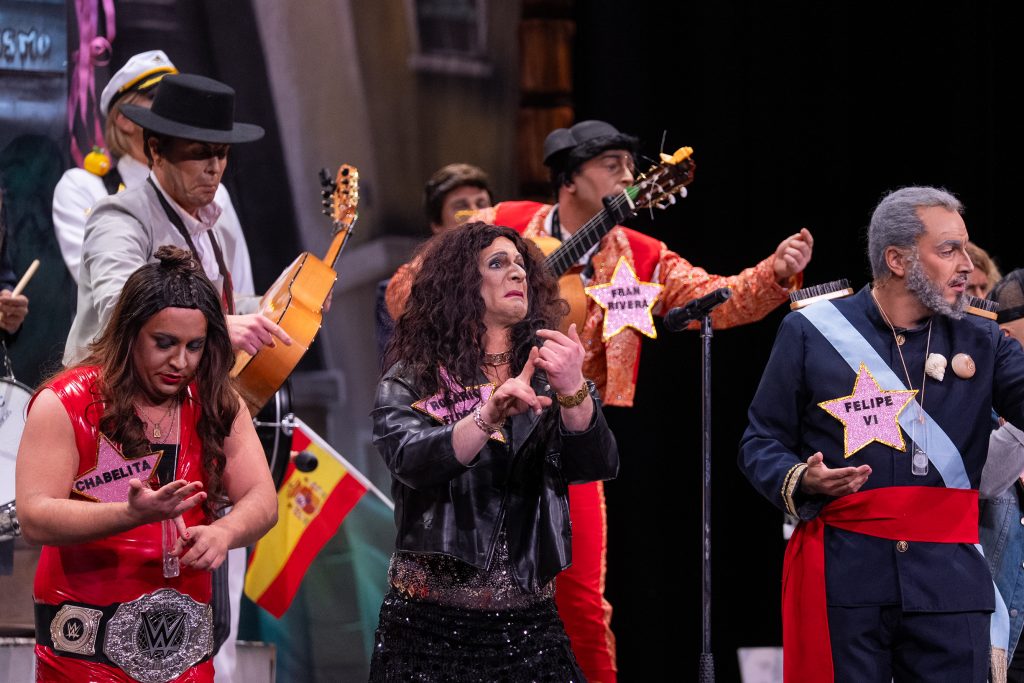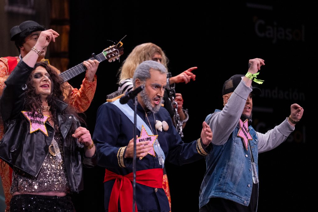 La presentación resolvió el concepto sin ambigüedad: los personajes eran Pocholo, Froilán, Enrique Iglesias, Chabelita, Kiko Rivera, Andreíta y el propio Felipe VI, entre otros. Cada uno aparecía rotulado para facilitar la identificación y el grupo explicó desde la primera cuarteta su tesis: “para llegar lejos en el concurso hay que tener un buen disfraz y un nombre puntero”. Con ese planteamiento, la chirigota buscó generar humor desde la genealogía mediática y desde la acumulación de tópicos, apoyándose en la caricatura del linaje y en el contraste entre fama y vacío.