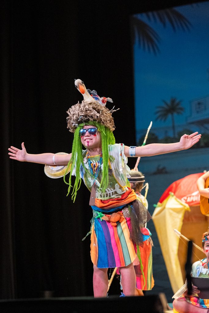 El tipo volvió a ser uno de los grandes reclamos de la actuación. La chirigota se presentó como una tribu caletera, con un vestuario muy elaborado y repleto de detalles reconocibles. Las plumas del tocado incluían fichas de parchís y de lotería, elementos elaborados por las propias familias, que aportaron un componente artesanal y familiar al conjunto. A ello se sumaron referencias constantes a la vida diaria en la playa, con cubos, patatas fritas, gaviotas y símbolos del Carnaval de Cádiz que reforzaron la identidad del grupo desde la presentación.