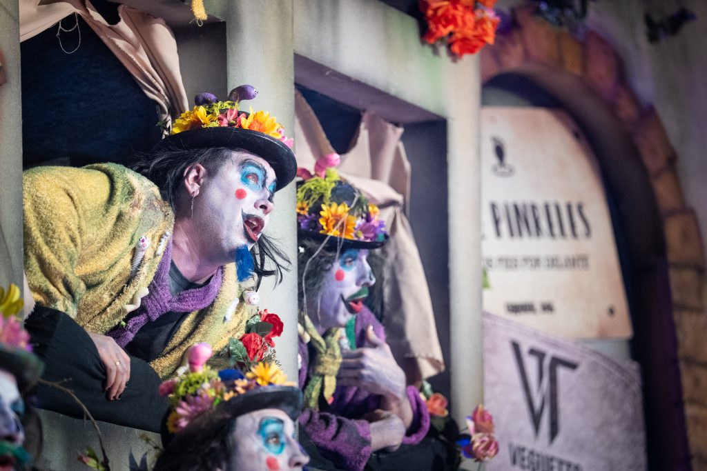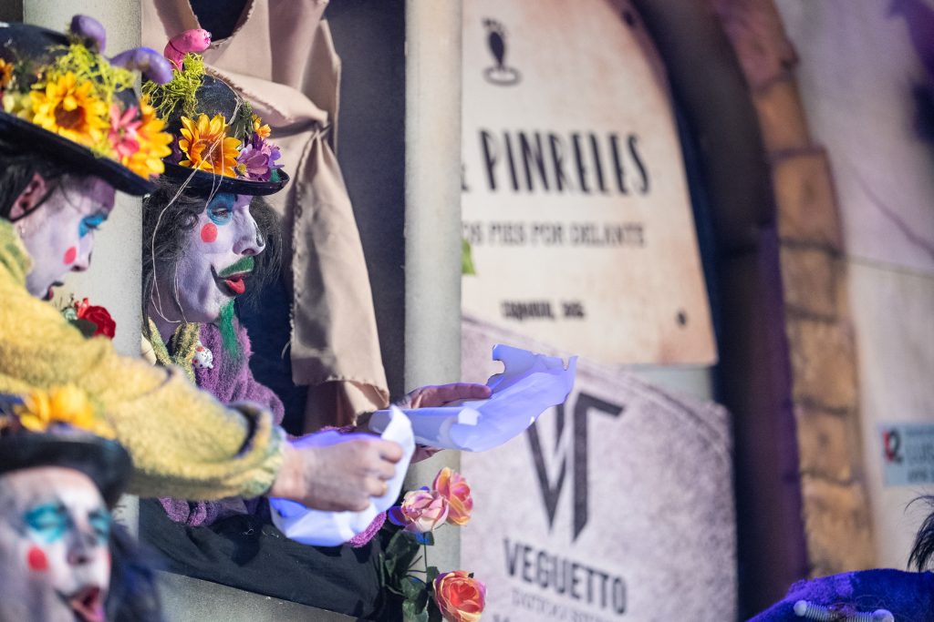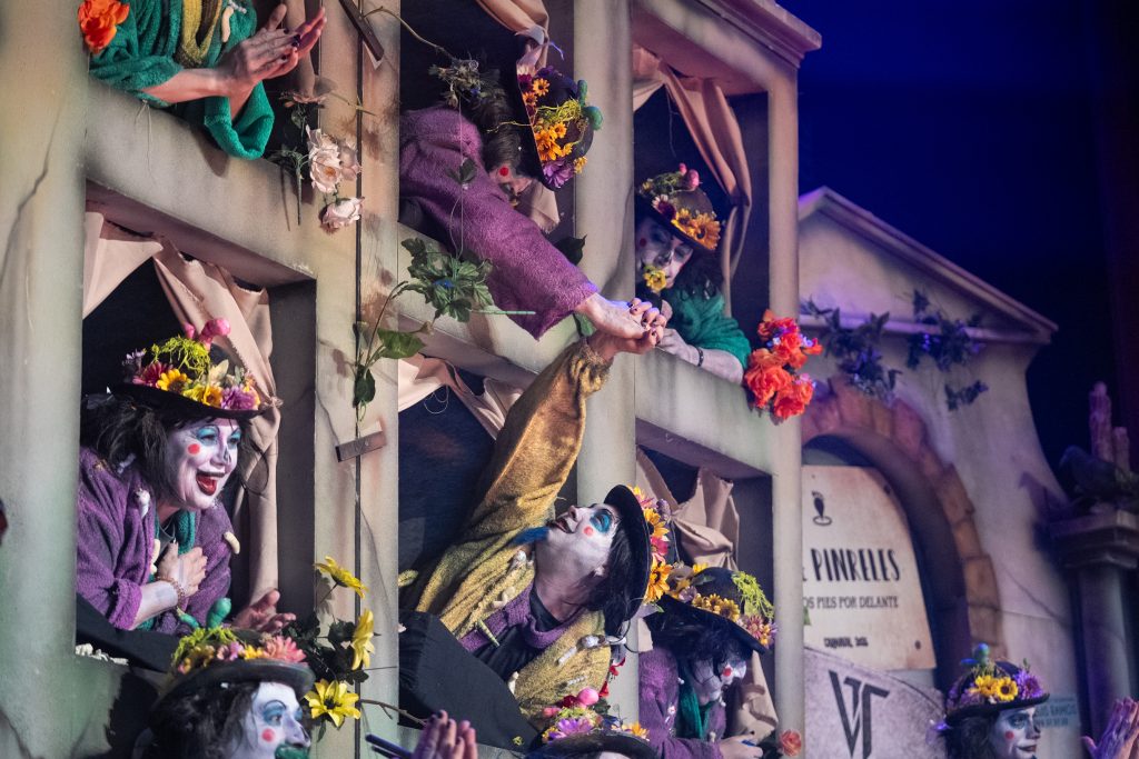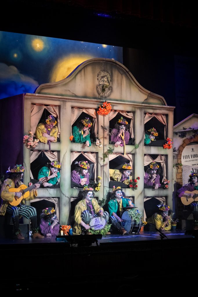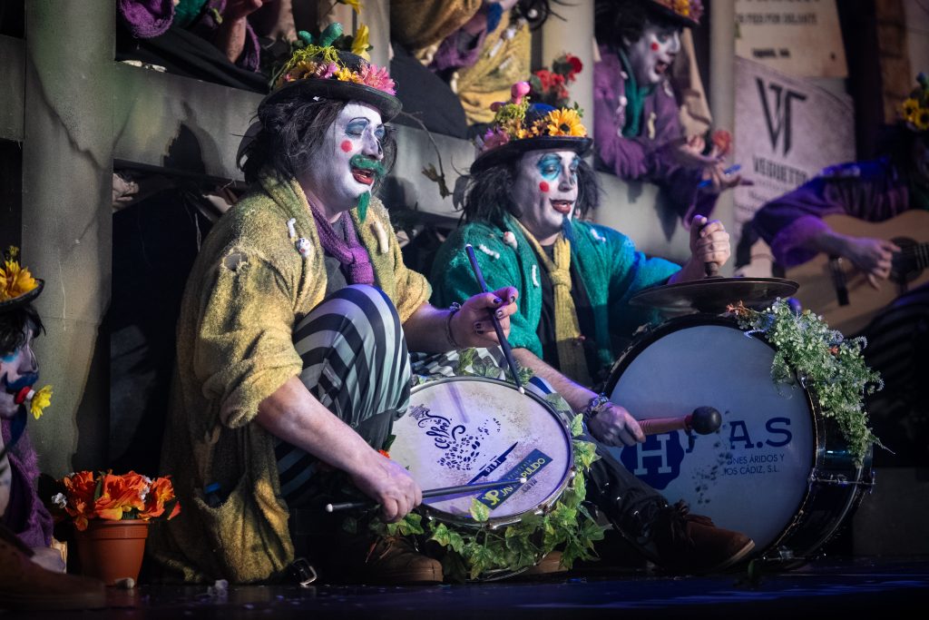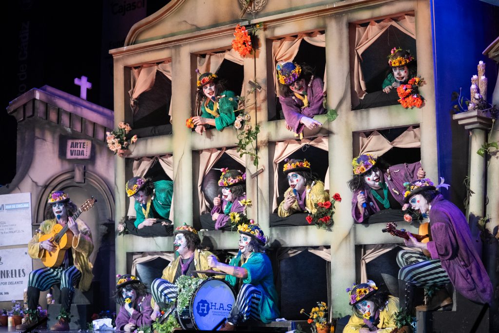 Desde la presentación, la chirigota dejó claras sus intenciones. El arranque fue movido, con ritmo y una interpretación muy sólida que logró predisponer al teatro desde el primer minuto. El tipo, reconocible y fácilmente entendible, permitió jugar con la idea de la muerte desde una óptica humorística muy terrenal, con constantes guiños a la actualidad y a problemas cotidianos. El cementerio se convierte así en un espacio escénico versátil, utilizado como excusa para lanzar mensajes y remates directos.