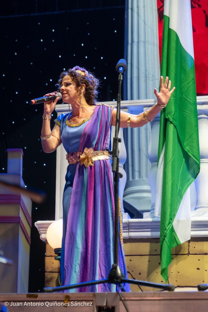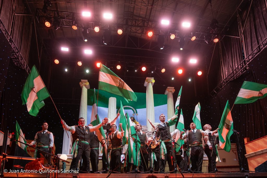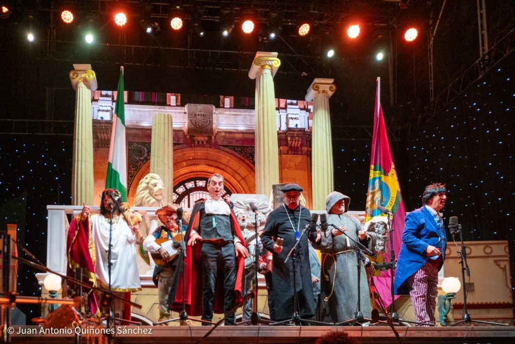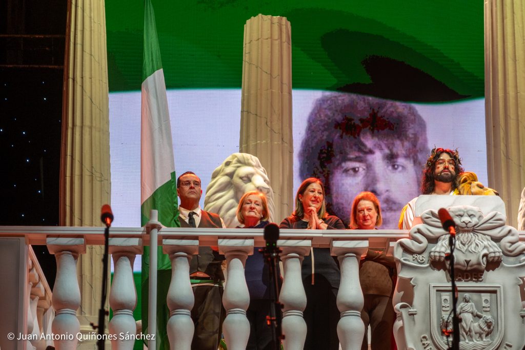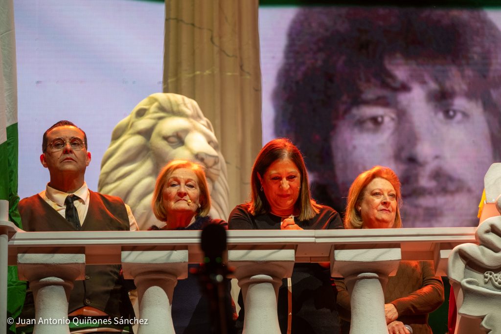 Durante el pregón fueron apareciendo distintos invitados y personajes que enriquecieron la narración. Entre ellos, Jesús Bienvenido, al que el pregonero presentó como parte fundamental del imaginario carnavalesco contemporáneo, con el que recordó a Manuel José García Caparrós, símbolo del andalucismo y de la lucha por la autonomía. También tuvieron presencia las hermanas de García Caparrós, Paqui, Loli y Puri, en un momento cargado de simbolismo en torno a la bandera andaluza y la memoria democrática.