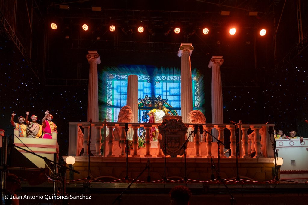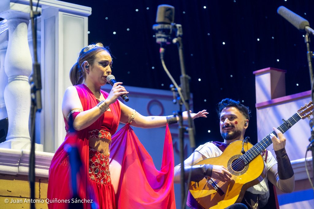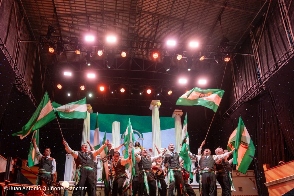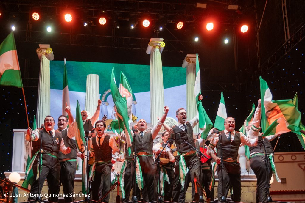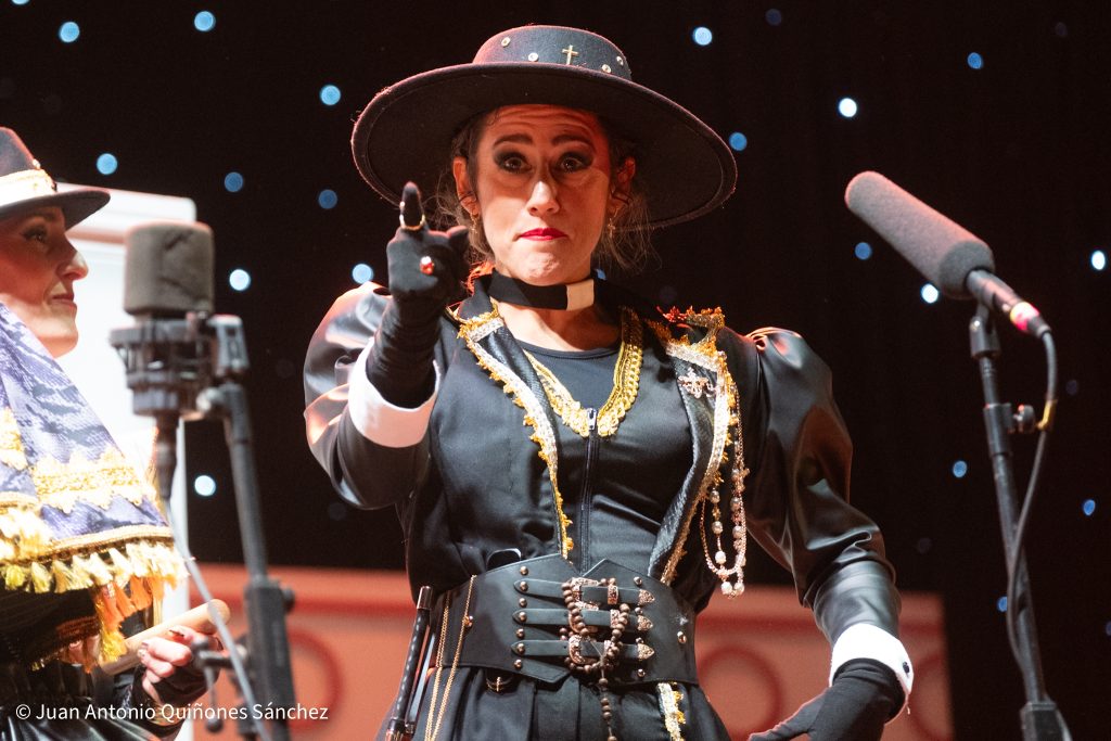 Durante el pregón fueron apareciendo distintos invitados y personajes que enriquecieron la narración. Entre ellos, Jesús Bienvenido, al que el pregonero presentó como parte fundamental del imaginario carnavalesco contemporáneo, con el que recordó a Manuel José García Caparrós, símbolo del andalucismo y de la lucha por la autonomía. También tuvieron presencia las hermanas de García Caparrós, Paqui, Loli y Puri, en un momento cargado de simbolismo en torno a la bandera andaluza y la memoria democrática.