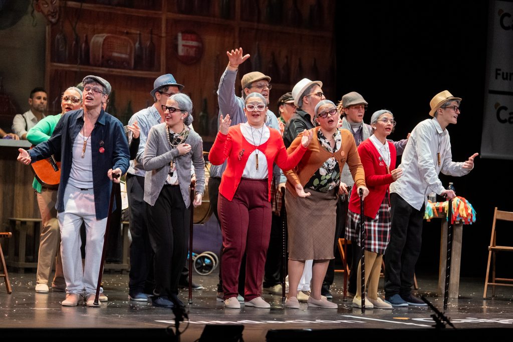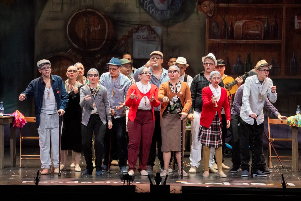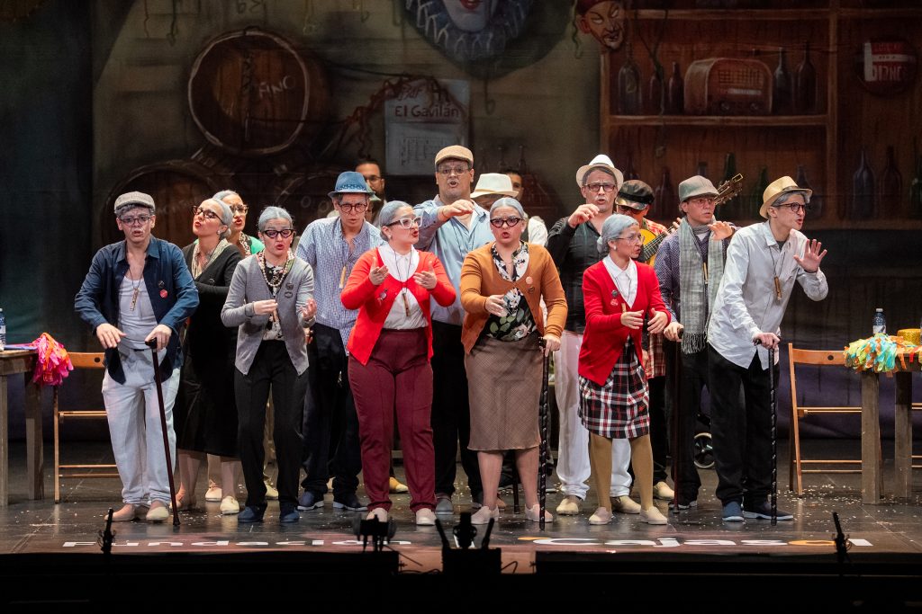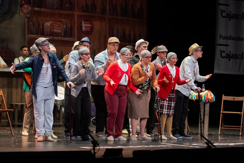 Desde el inicio, la escenografía situó la acción en varios planos, con un decorado que evocaba un local clásico de Cádiz, punto de encuentro para aficionados y autores. La presentación se construyó como una escena cotidiana entre personajes veteranos, con diálogo previo al cante que sirvió para introducir el tono general del repertorio. A partir de ahí, la comparsa se presentó apelando a la esencia del Carnaval, al canto contenido y al compás tradicional, reivindicando una forma de interpretar asociada a la escuela clásica.