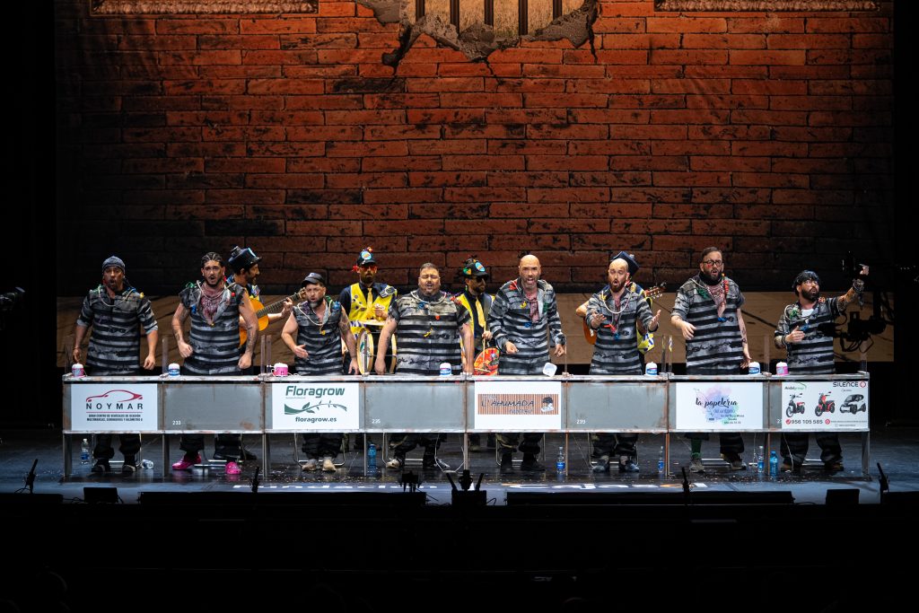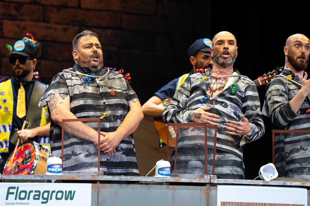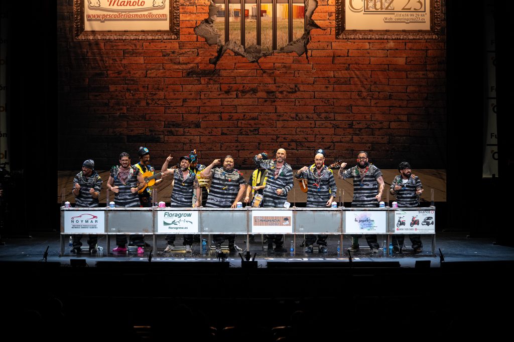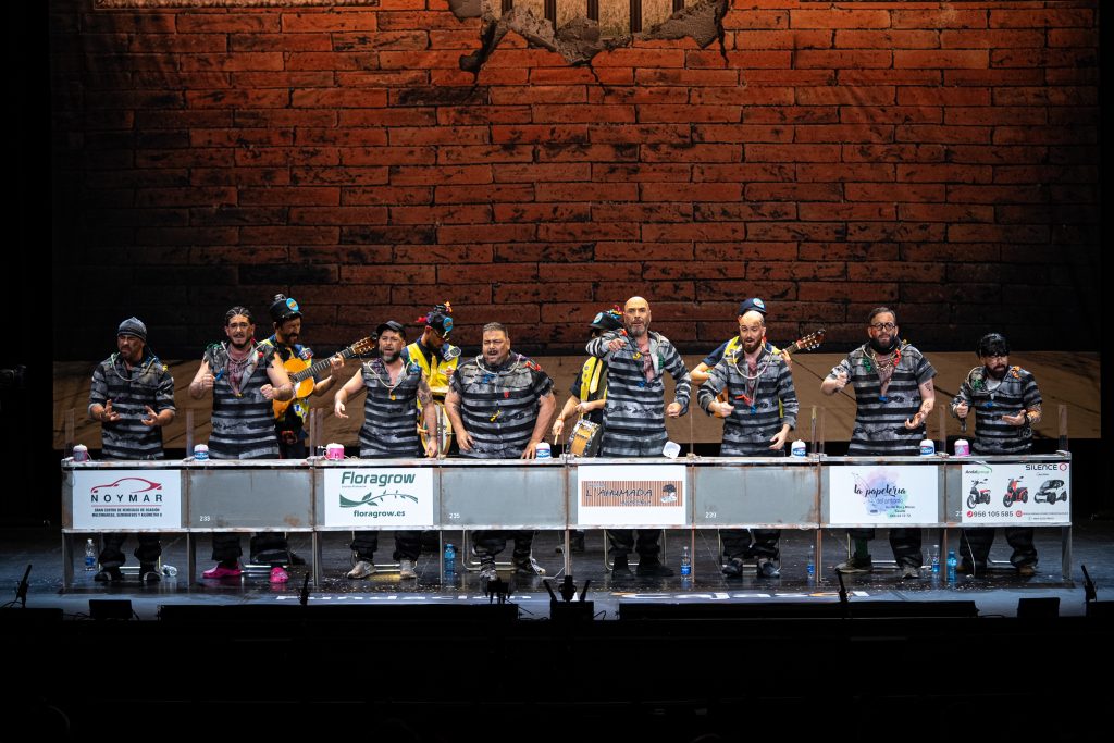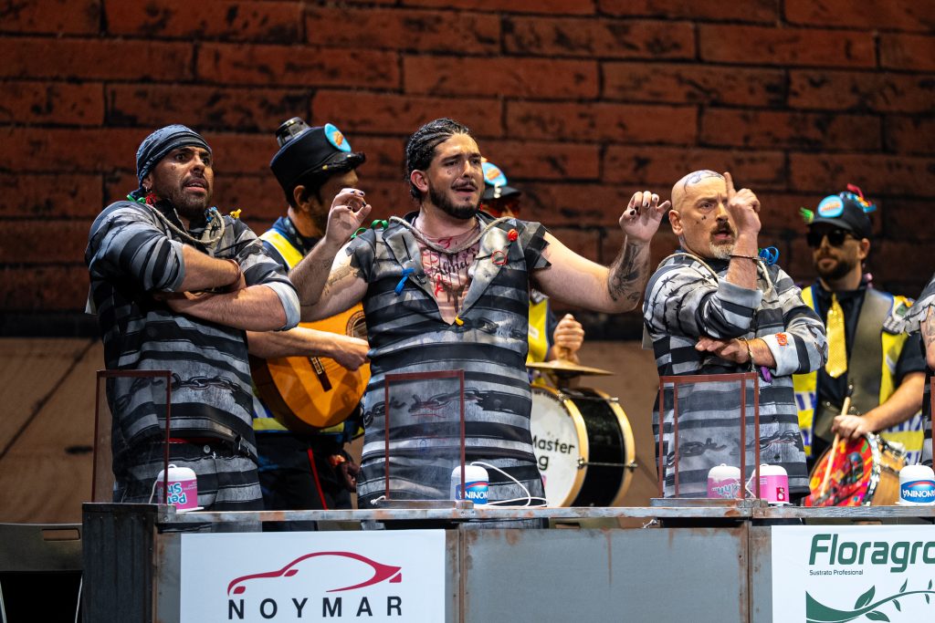 La presentación sitúa de inmediato al espectador en el espacio escénico. Los personajes se muestran como reclusos esperando visitas en el vis a vis, con referencias reconocibles al imaginario carcelario y algunos golpes aislados que funcionan en el arranque. Aparecen menciones de actualidad y guiños conocidos, pero tras ese inicio el tipo empieza a mostrar rápidamente sus limitaciones. El planteamiento resulta poco agradecido para la chirigota y no ofrece una vía clara para el desarrollo humorístico sostenido.