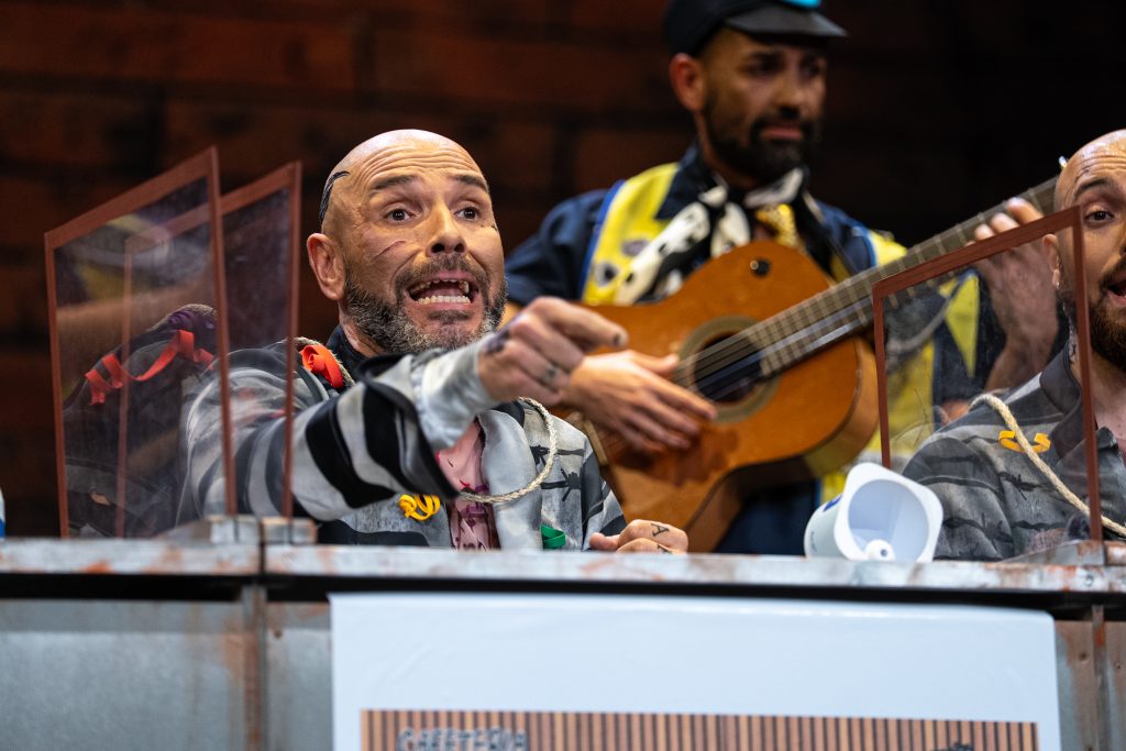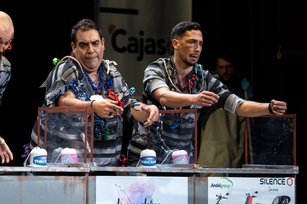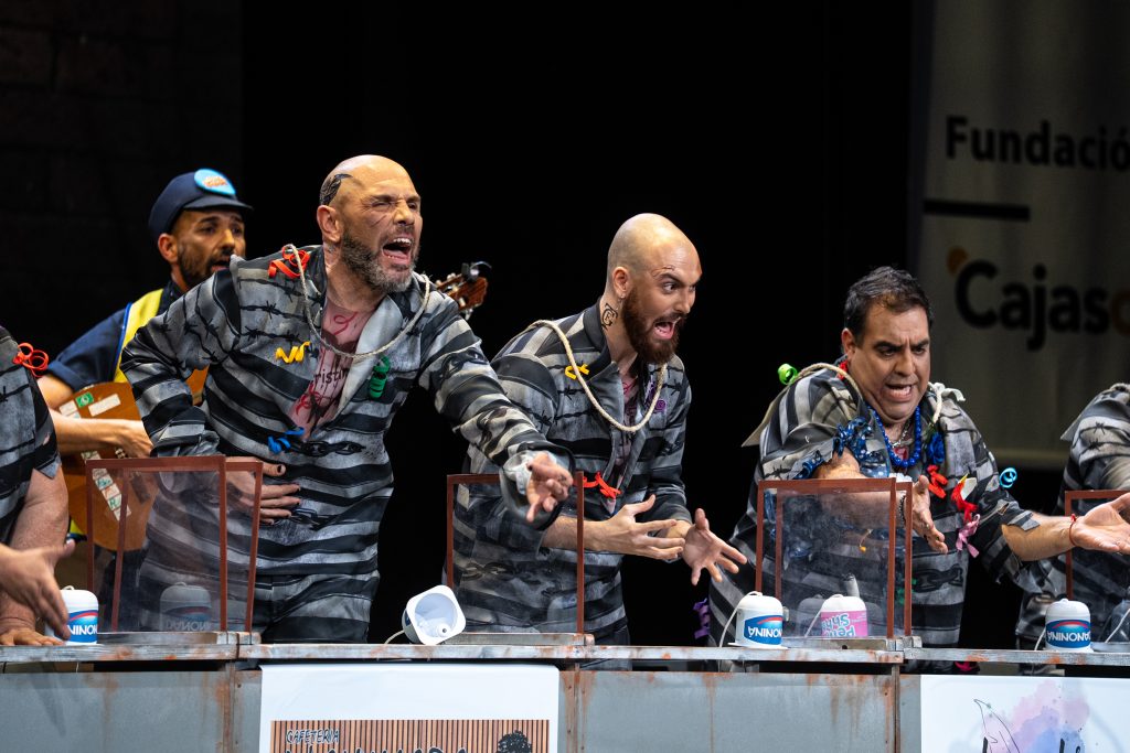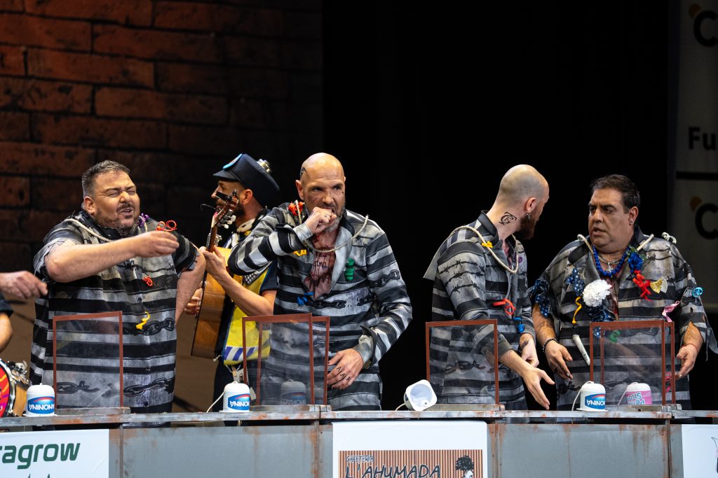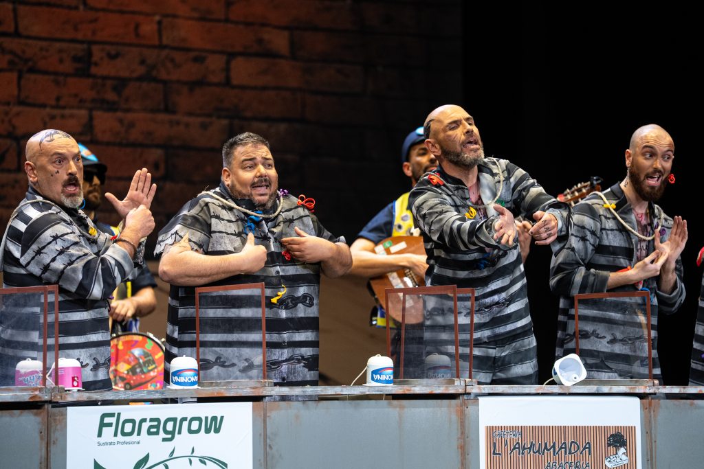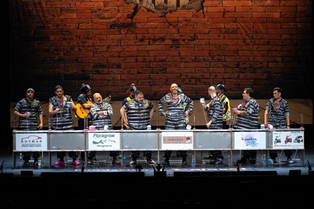 La presentación sitúa de inmediato al espectador en el espacio escénico. Los personajes se muestran como reclusos esperando visitas en el vis a vis, con referencias reconocibles al imaginario carcelario y algunos golpes aislados que funcionan en el arranque. Aparecen menciones de actualidad y guiños conocidos, pero tras ese inicio el tipo empieza a mostrar rápidamente sus limitaciones. El planteamiento resulta poco agradecido para la chirigota y no ofrece una vía clara para el desarrollo humorístico sostenido.