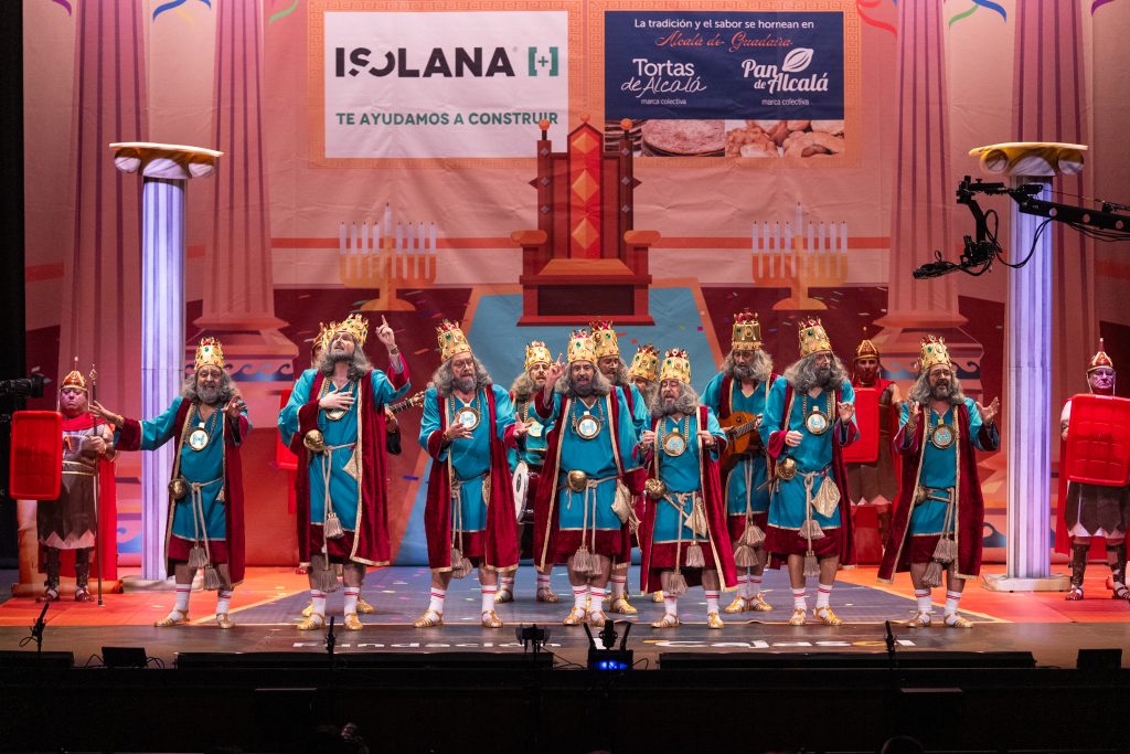 La presentación definió el marco cómico y dejó claro desde el inicio el significado del nombre. La chirigota utilizó la melodía de ‘Stayin’ Alive’ de los Bee Gees para describir la llegada del personaje bíblico al escenario y justificar la temática central del repertorio: el cansancio parental ante las demandas constantes de la crianza moderna. La aparición de romanos como figurantes completó la escena y permitió jugar con la iconografía navideña.