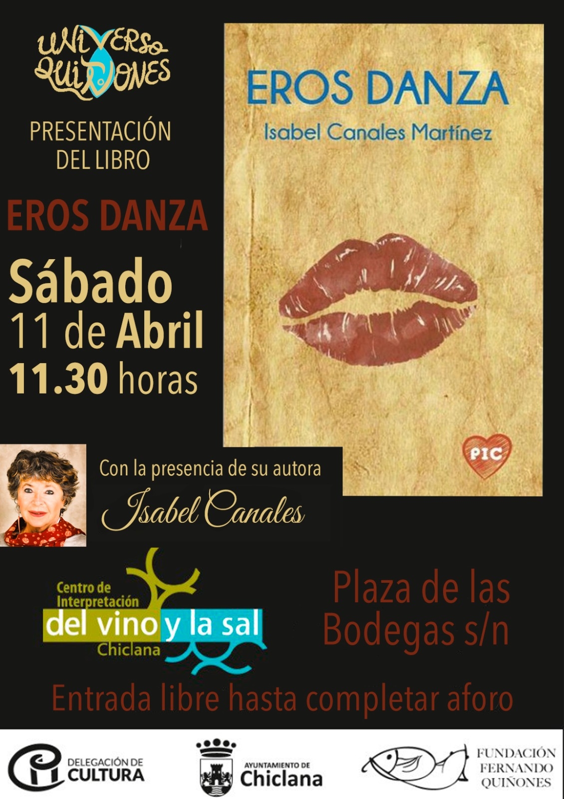 La Fundación Fernando Quiñones celebrará este sábado 11 de abril la presentación del libro ‘Eros Danza’ en Chiclana, un acto cultural que tendrá lugar a las 11.30 horas en el Centro de Interpretación del Vino y la Sal. La actividad contará con la presencia de la autora, Isabel Canales, y la entrada será libre hasta completar aforo.