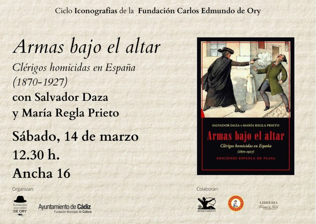 La Fundación Carlos Edmundo de Ory acogerá en Cádiz la presentación del libro Armas bajo el altar, una obra de investigación histórica firmada por Salvador Daza Palacios y María Regla Prieto Corbalán. El acto tendrá lugar el sábado 14 de marzo a las 12.30 horas en la sede de la fundación, situada en la calle Ancha, 16.