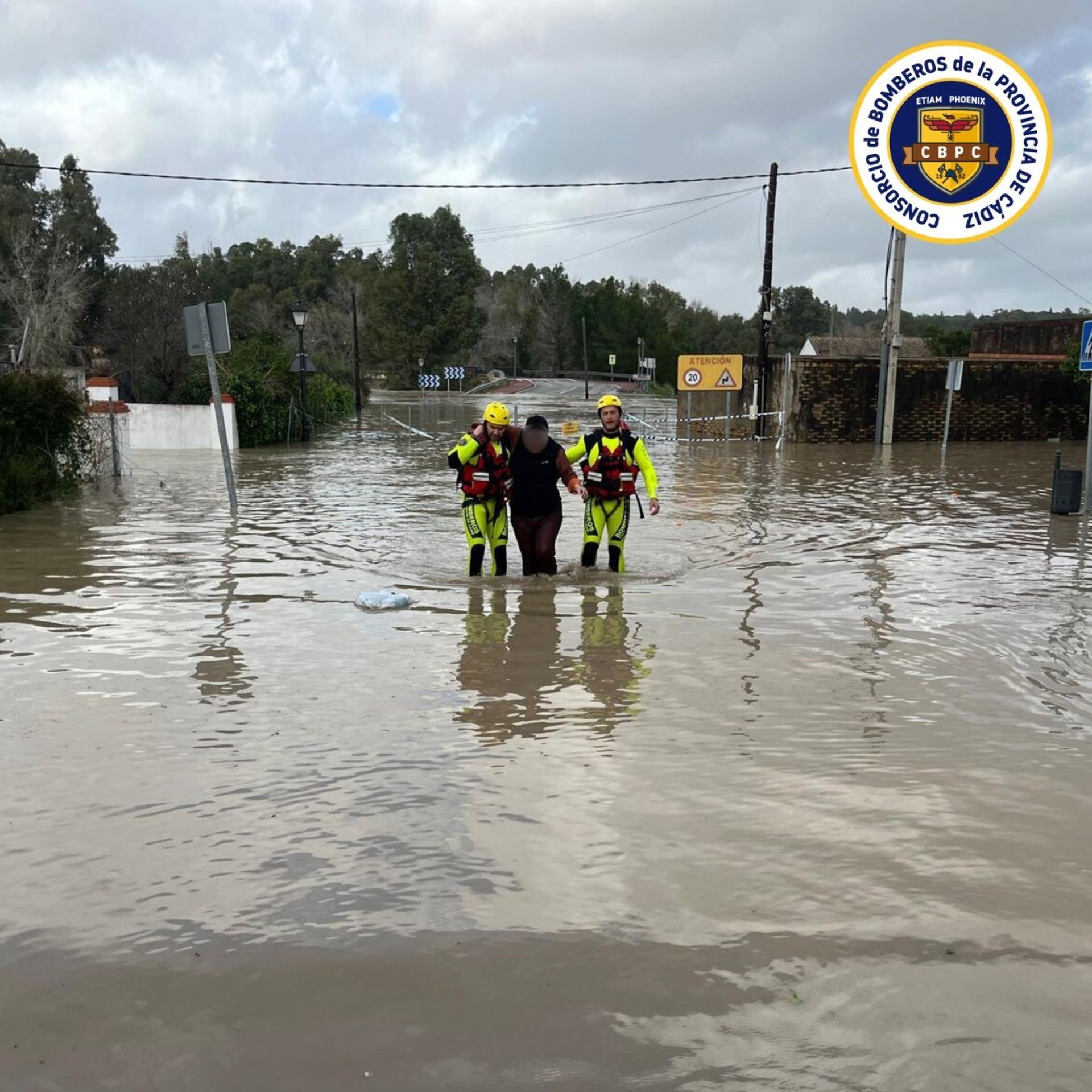 Efectivos del Consorcio Provincial de Bomberos de Cádiz han rescatado en la tarde de este jueves a seis personas que habían quedado aisladas en dos viviendas situadas en la zona del puente de Angorrilla, en Arcos de la Frontera, como consecuencia de la subida del caudal de la presa.