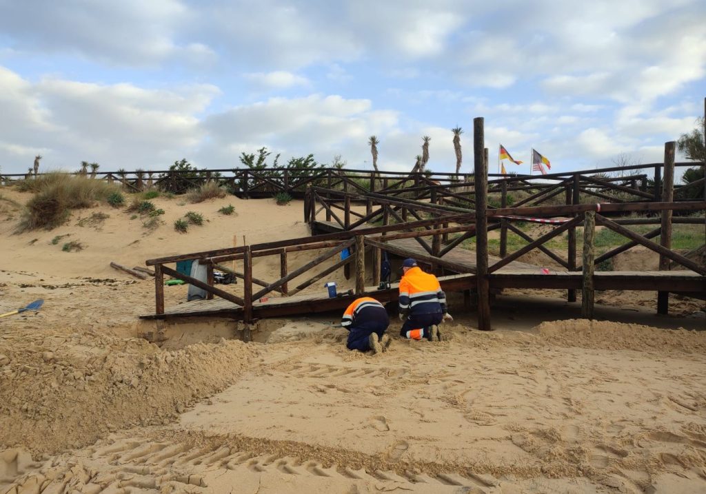Los trabajos continúan condicionados por el mal tiempo y la pérdida de arena en accesos afectados por la borrasca Francis