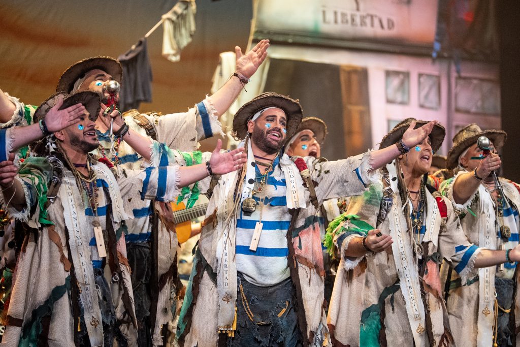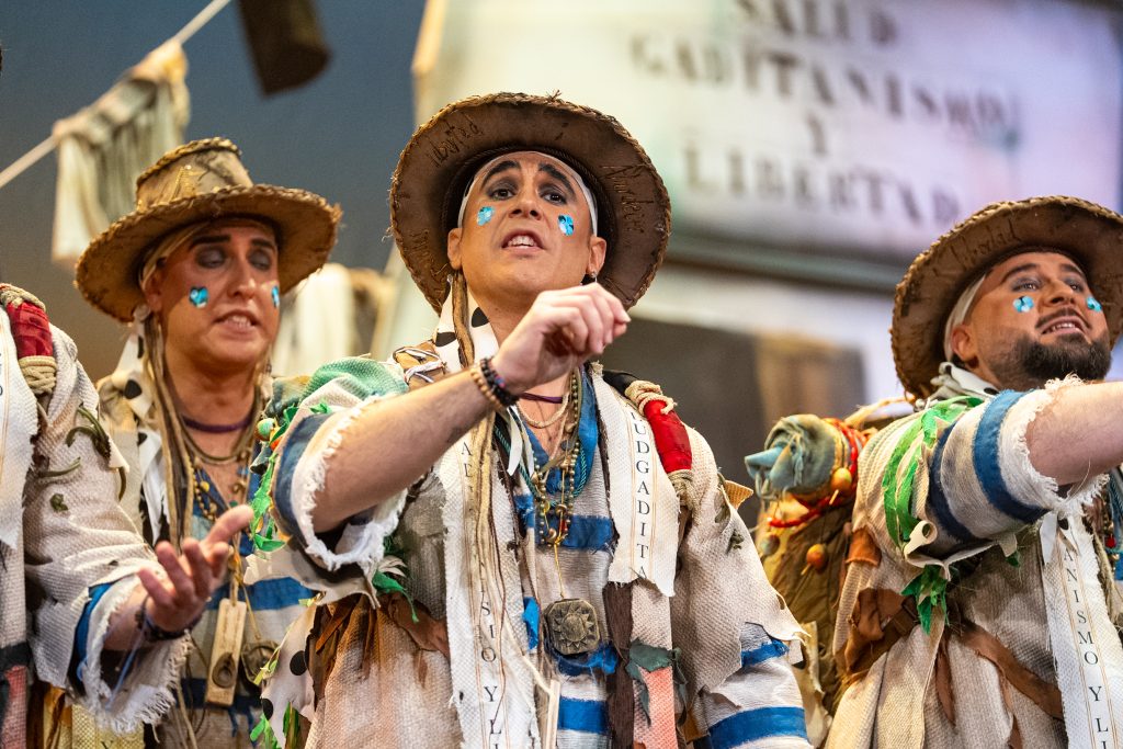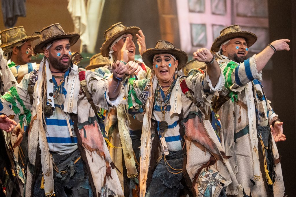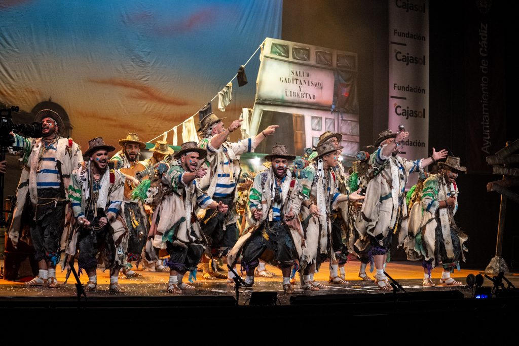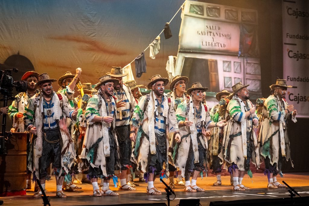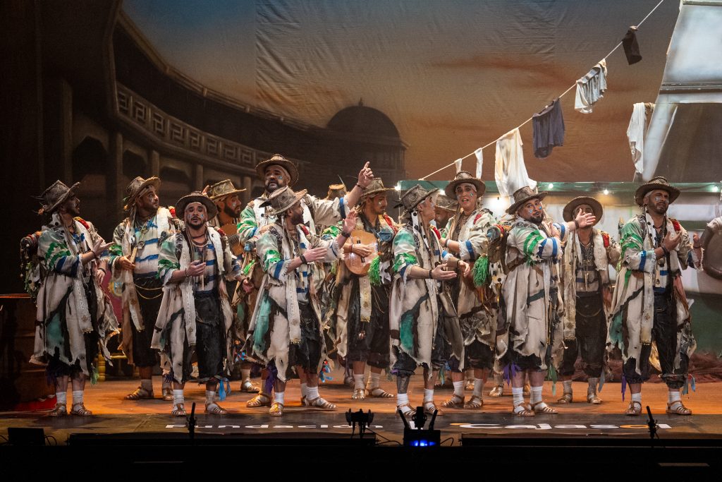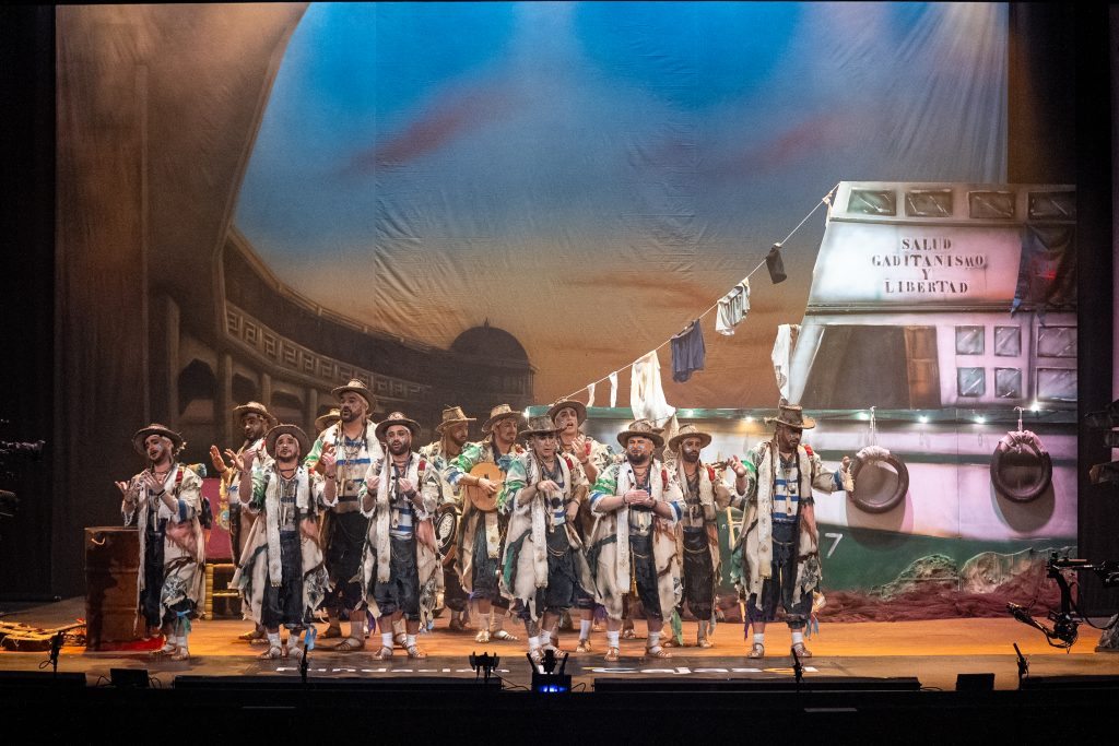 La presentación definió el código del tipo desde el primer momento. Los intérpretes, en disposición circular y con la bahía como referencia escenográfica, introdujeron el tono de catecismo gaditano: Cádiz como fe, dogma y misión. La letra apeló a la “palabrita de Cai” para activar la dimensión identitaria del repertorio y preparar la transición hacia el pasodoble. La recepción fue cálida y el teatro comprendió sin dificultad el planteamiento alegórico.