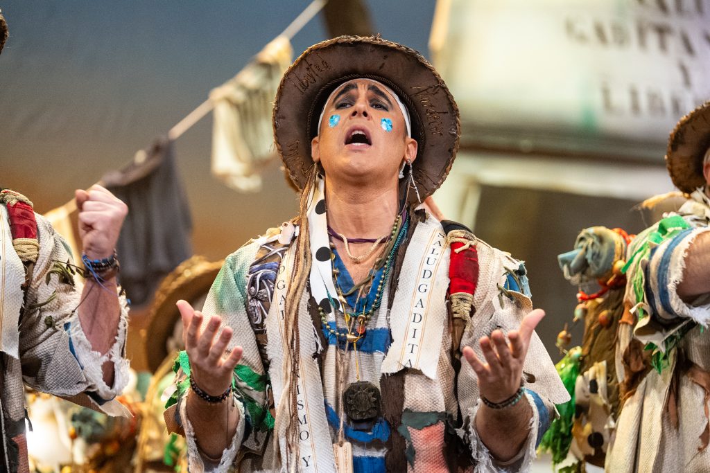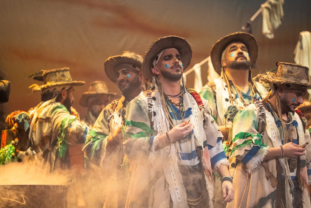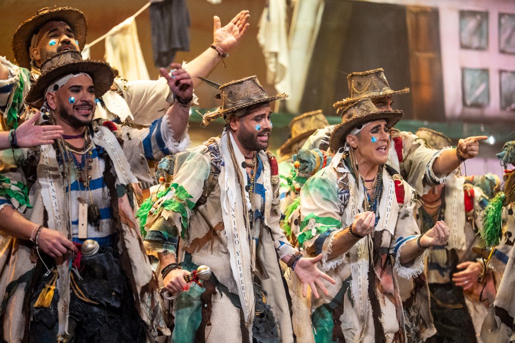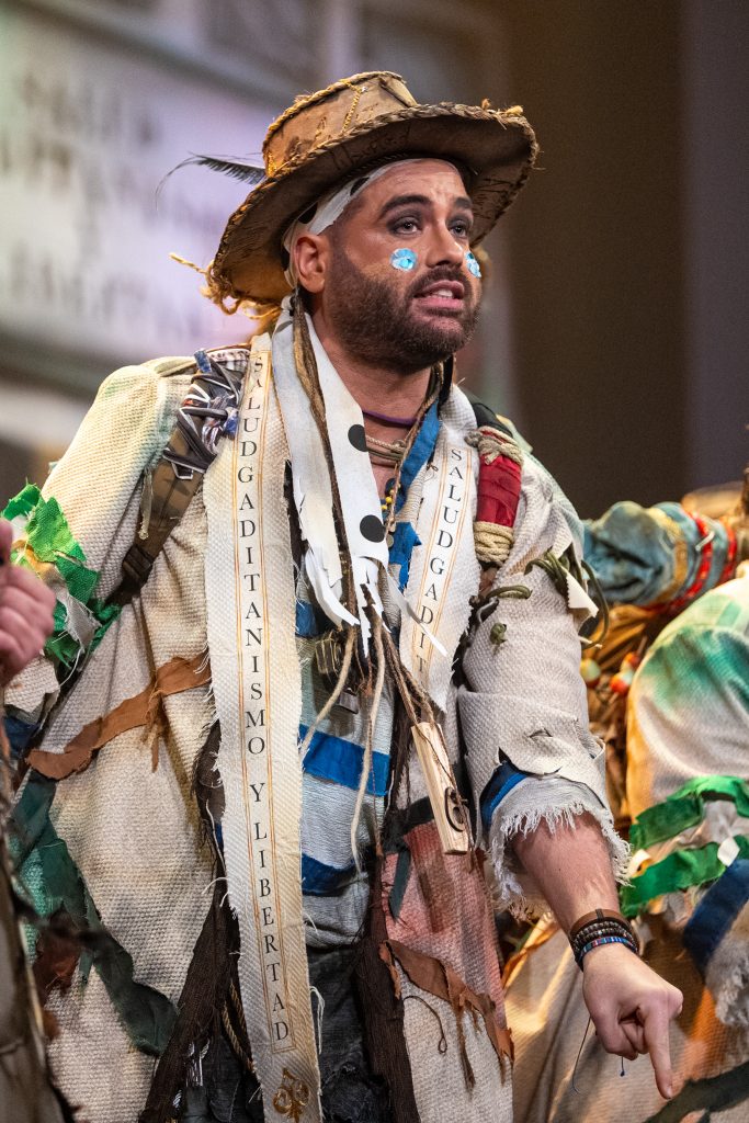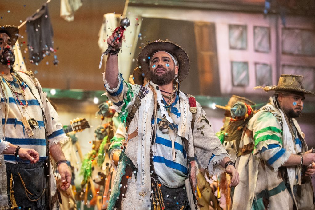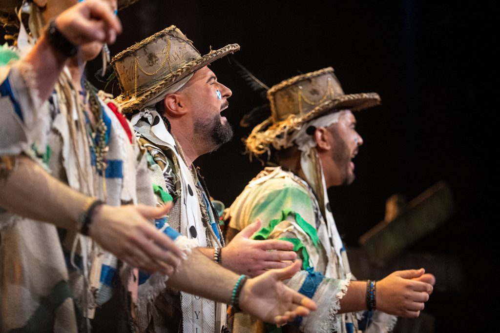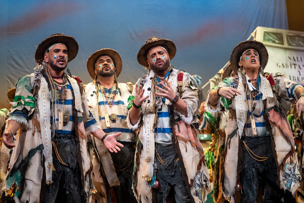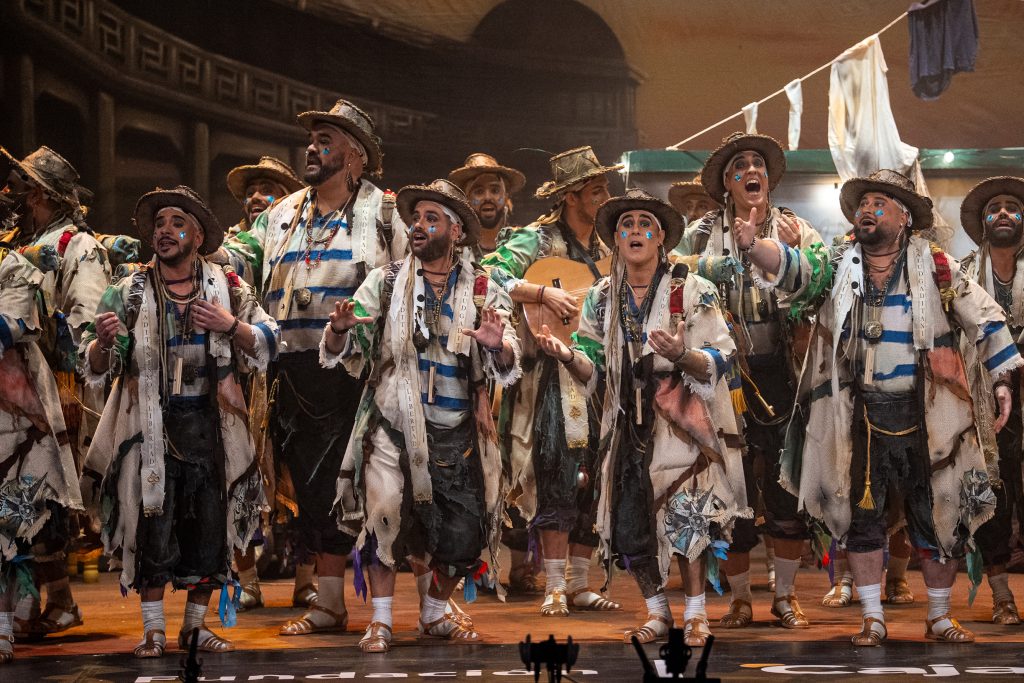 La presentación definió el código del tipo desde el primer momento. Los intérpretes, en disposición circular y con la bahía como referencia escenográfica, introdujeron el tono de catecismo gaditano: Cádiz como fe, dogma y misión. La letra apeló a la “palabrita de Cai” para activar la dimensión identitaria del repertorio y preparar la transición hacia el pasodoble. La recepción fue cálida y el teatro comprendió sin dificultad el planteamiento alegórico.
