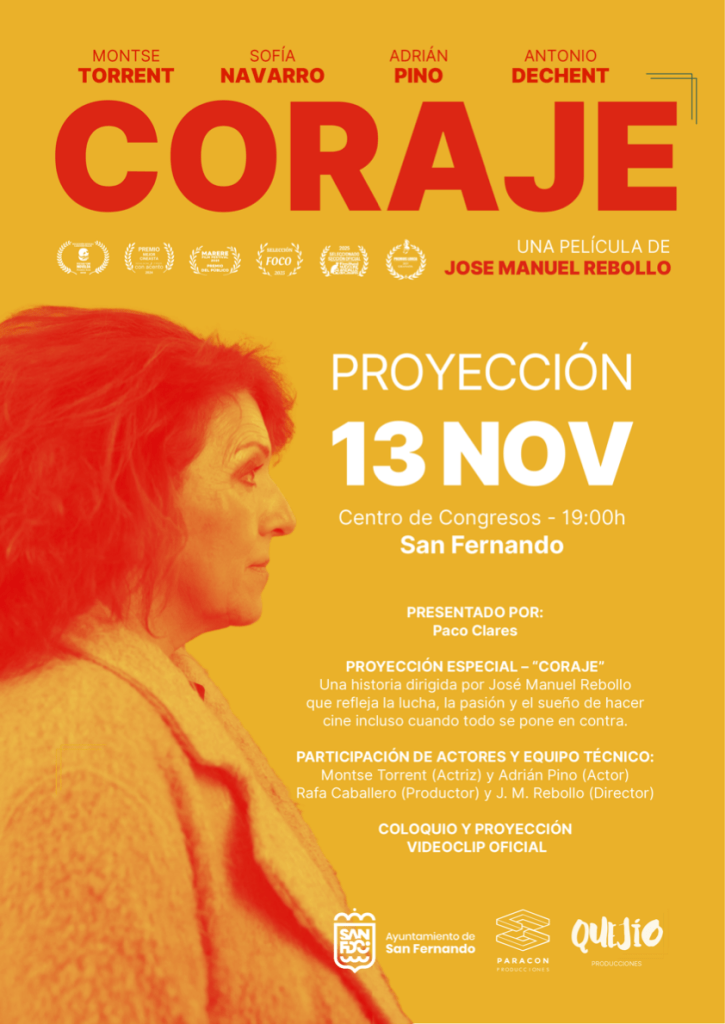 El Centro de Congresos “Cortes de la Real Isla de León” de San Fernando acogerá el próximo jueves 13 de noviembre la proyección especial del largometraje gaditano ‘Coraje’, una obra dirigida por José Manuel Rebollo y producida por Paracon Producciones y Quejío Producciones, en un evento organizado con la colaboración del Ayuntamiento de San Fernando.
