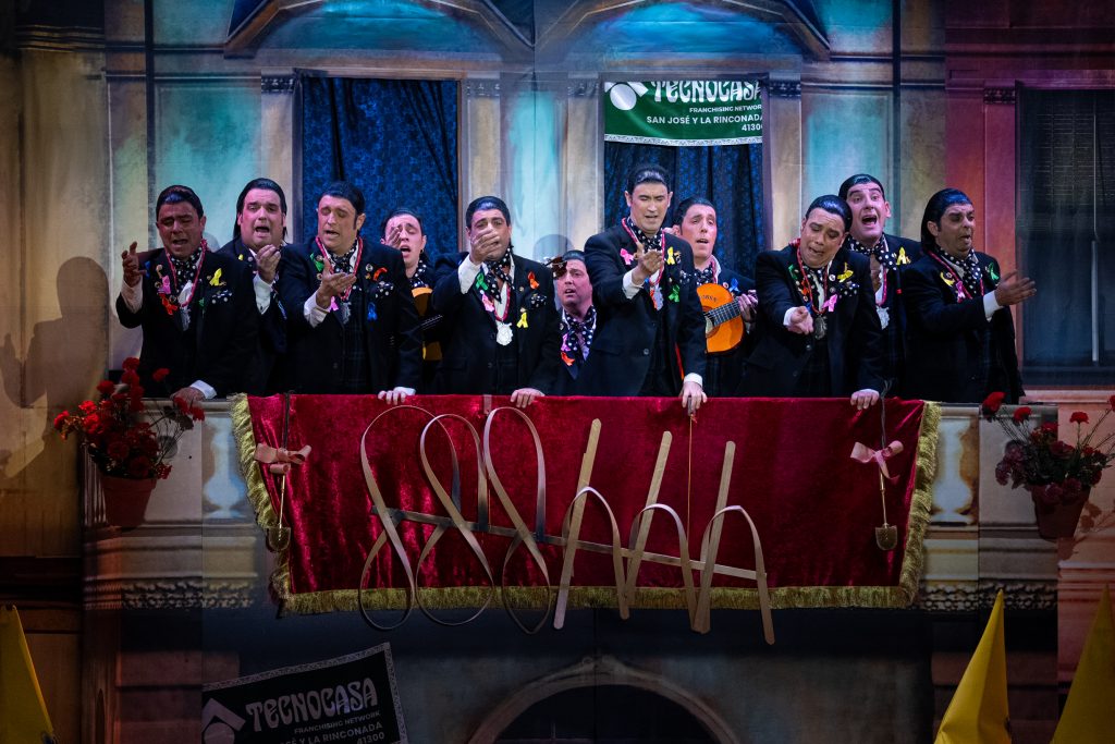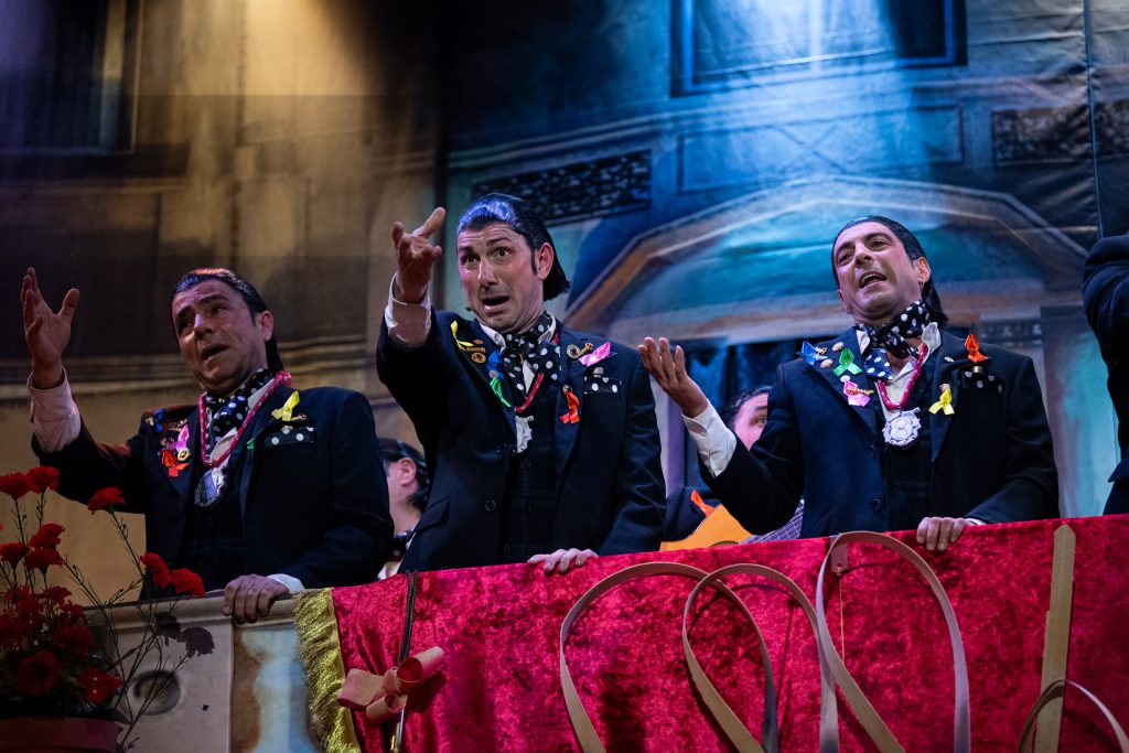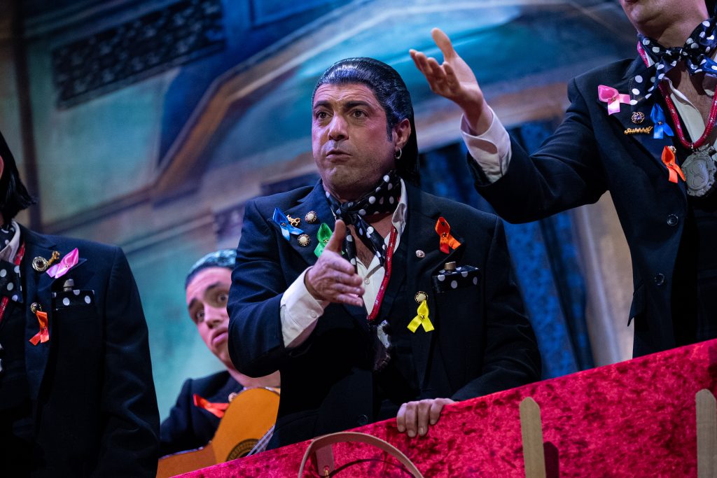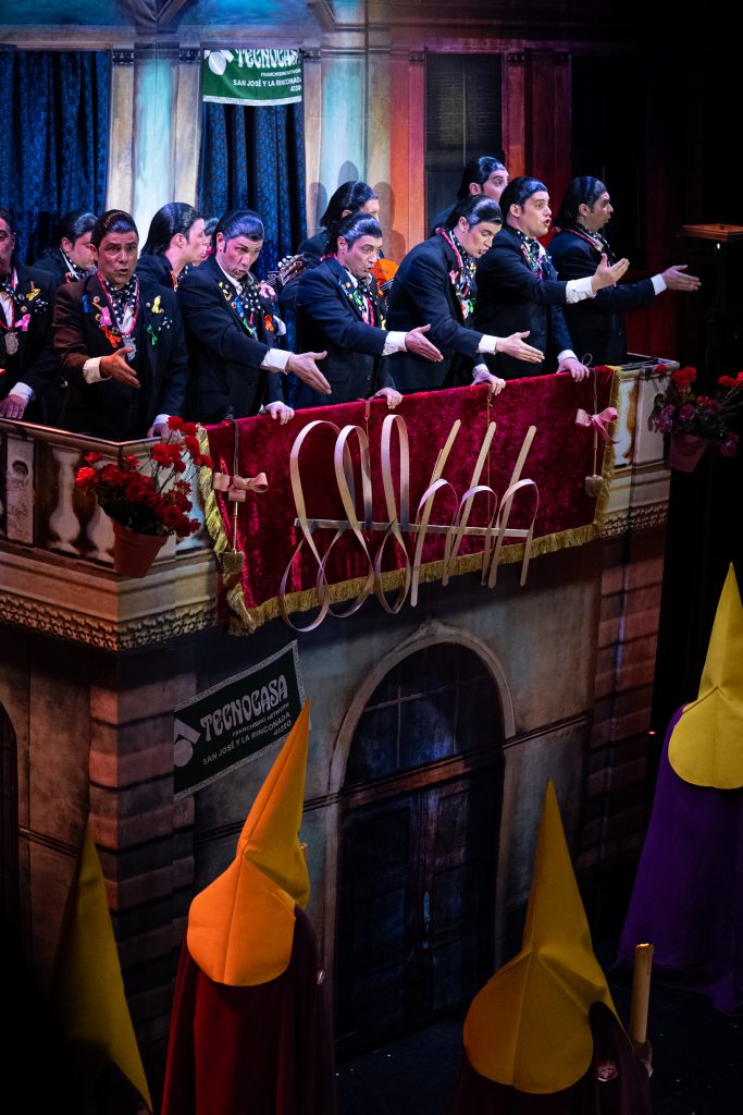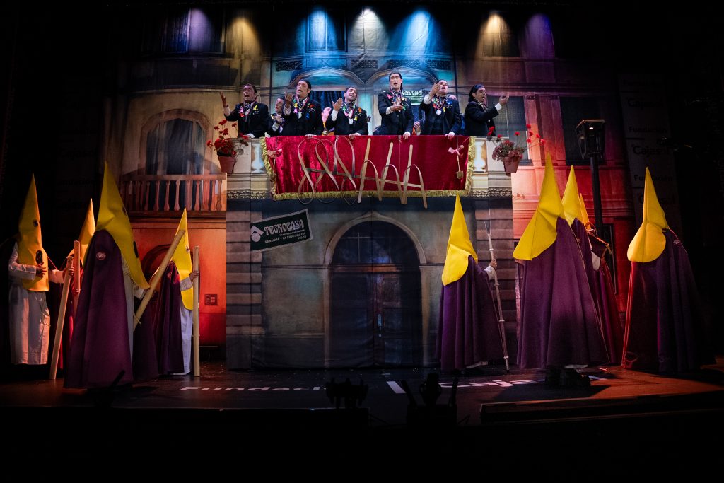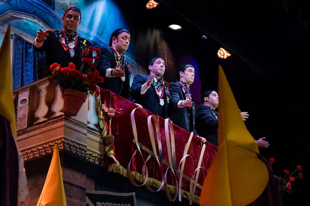 El tipo de saeteros que cantan en Carnaval está perfectamente definido desde el primer segundo. La presentación vuelve a ser una pieza clave del repertorio, con una integración muy inteligente de la música cofrade, el silencio como recurso dramático y una letra que explica sin rodeos por qué estas saetas suenan en febrero. No hay ajustes ni cambios respecto al primer pase: no los necesita. Funciona por ritmo, por afinación y por una idea clara que vertebra toda la actuación.