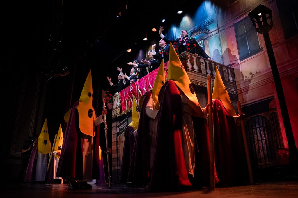 Los pasodobles mantienen un nivel altísimo y confirman la solvencia humorística del grupo. El primero se construye desde el costumbrismo, con la figura del vecino que pone la música a todo volumen incluso en la Madrugá. Las comparaciones surrealistas se suceden con naturalidad, destacando el gag central de Ketama y un remate muy efectivo que culmina en una pequeña venganza cofrade. La copla encaja perfectamente en el tipo y mantiene el equilibrio entre texto, música y golpe final.