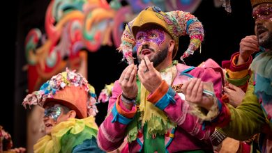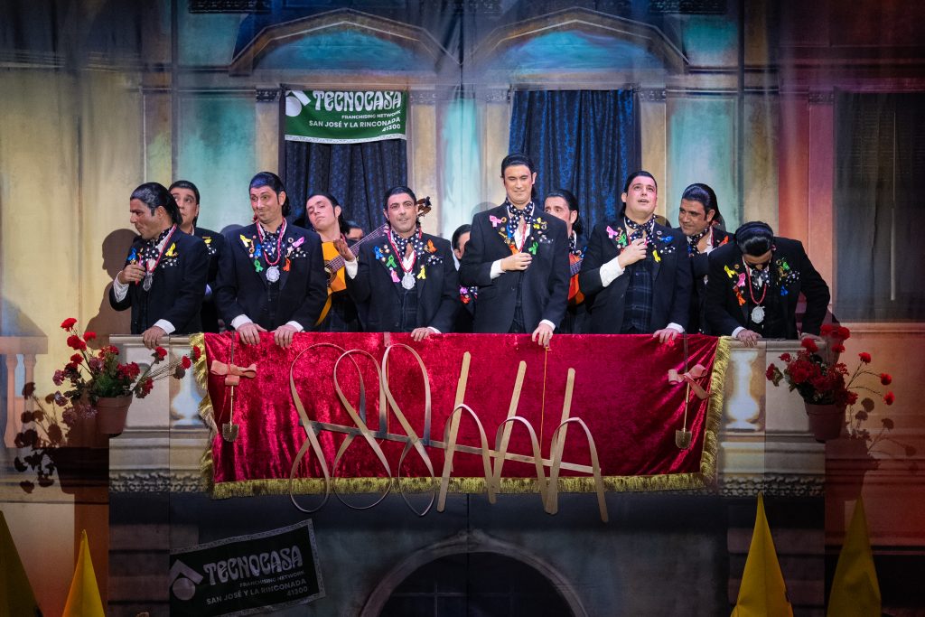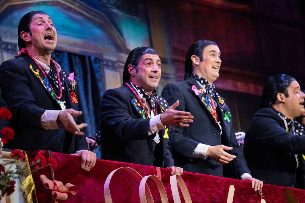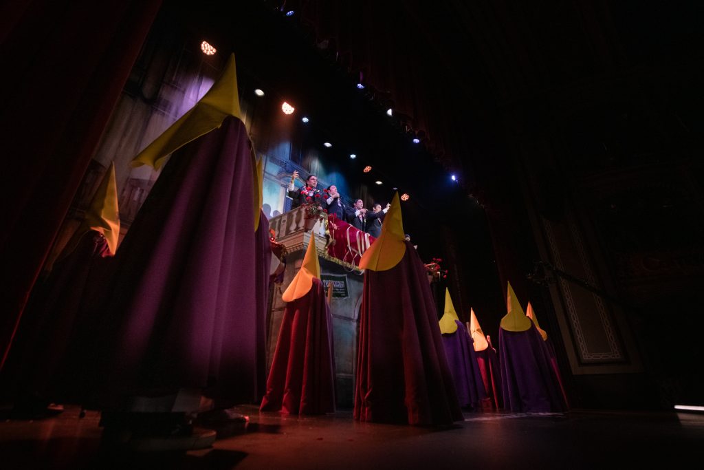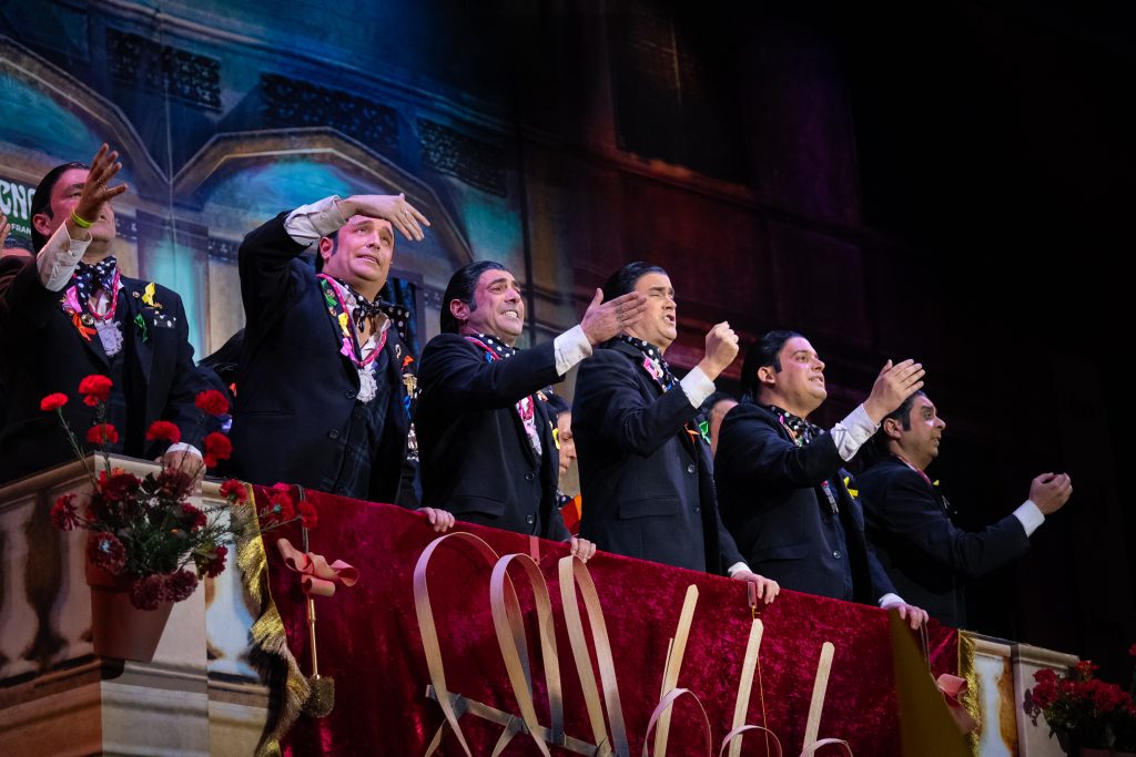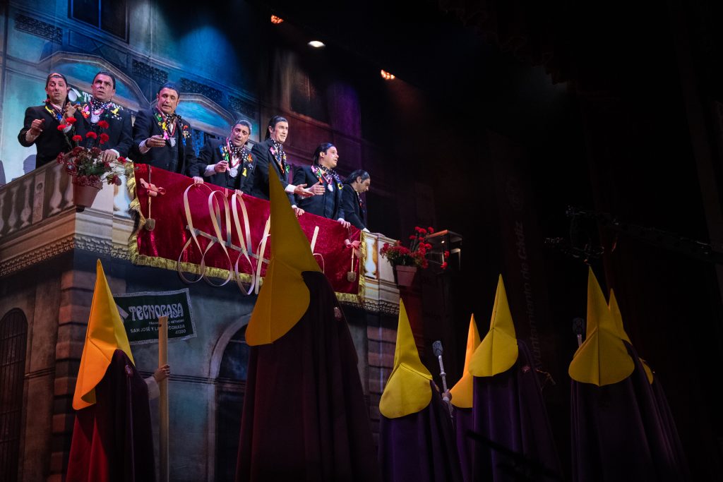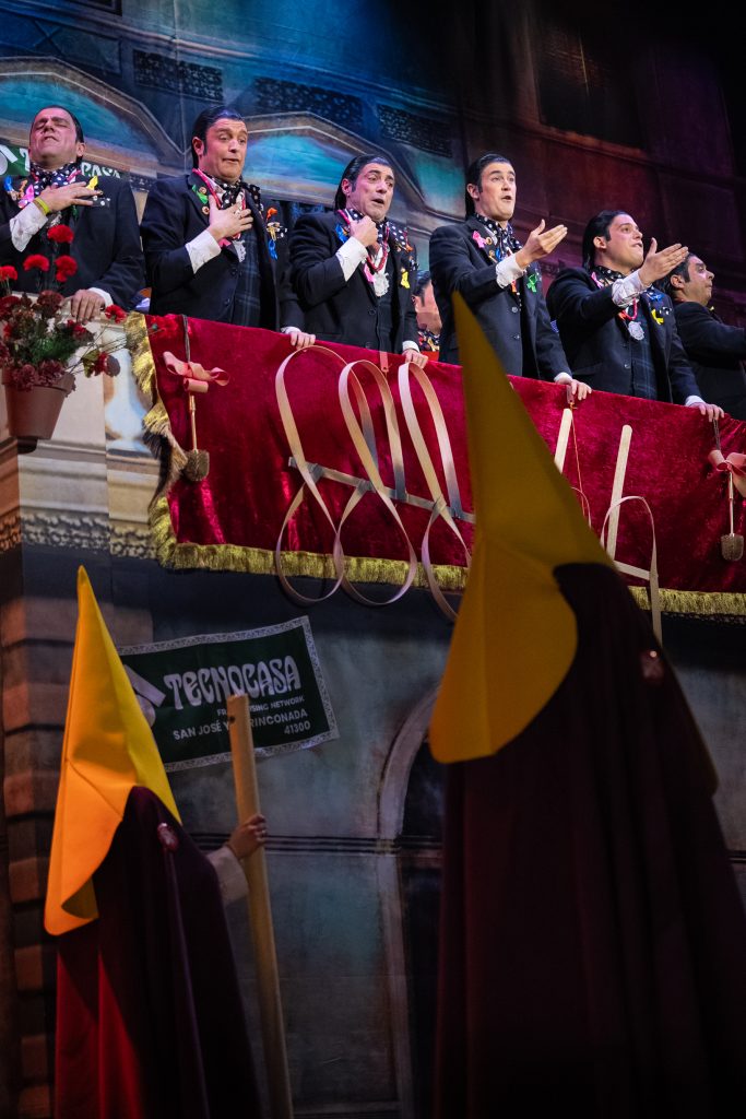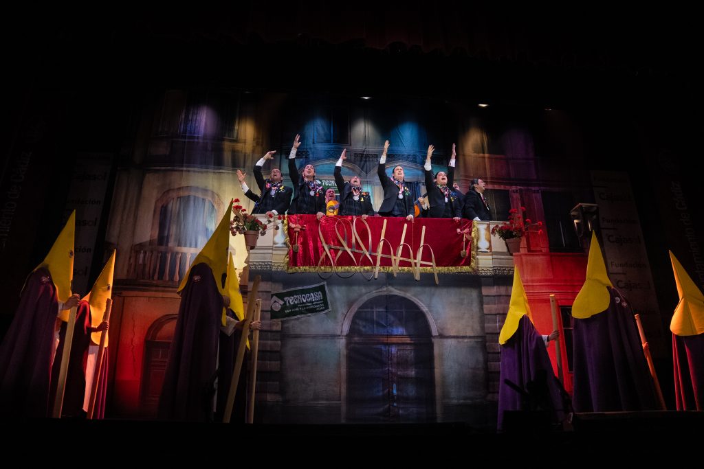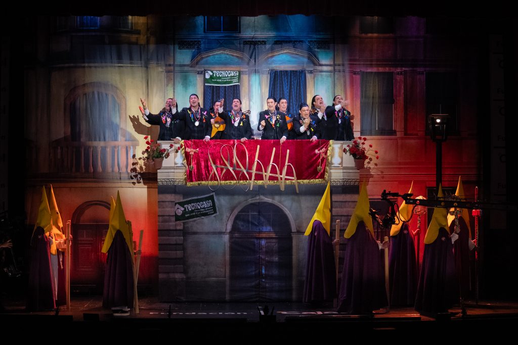 Desde la presentación, los saeteros por febrero marcan territorio. La idea de llevar la saeta al Carnaval no se queda en un simple recurso musical, sino que vertebra todo el repertorio. La entrada es potente, reconocible y directa, apoyada en una estética cofrade cuidada y en un uso inteligente del balcón, cuya colocación y altura vuelven a ser determinantes para la proyección escénica. El arranque predispone al público desde el primer segundo y deja claro que el grupo sabe perfectamente qué quiere contar y cómo hacerlo.