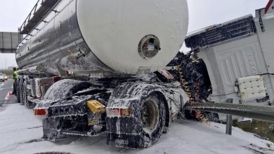 Bomberos intervienen en el vuelco de un camión cisterna con mercancías peligrosas en la A-7 en Los Barrios