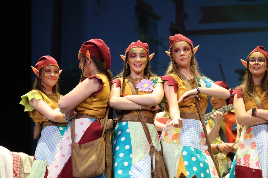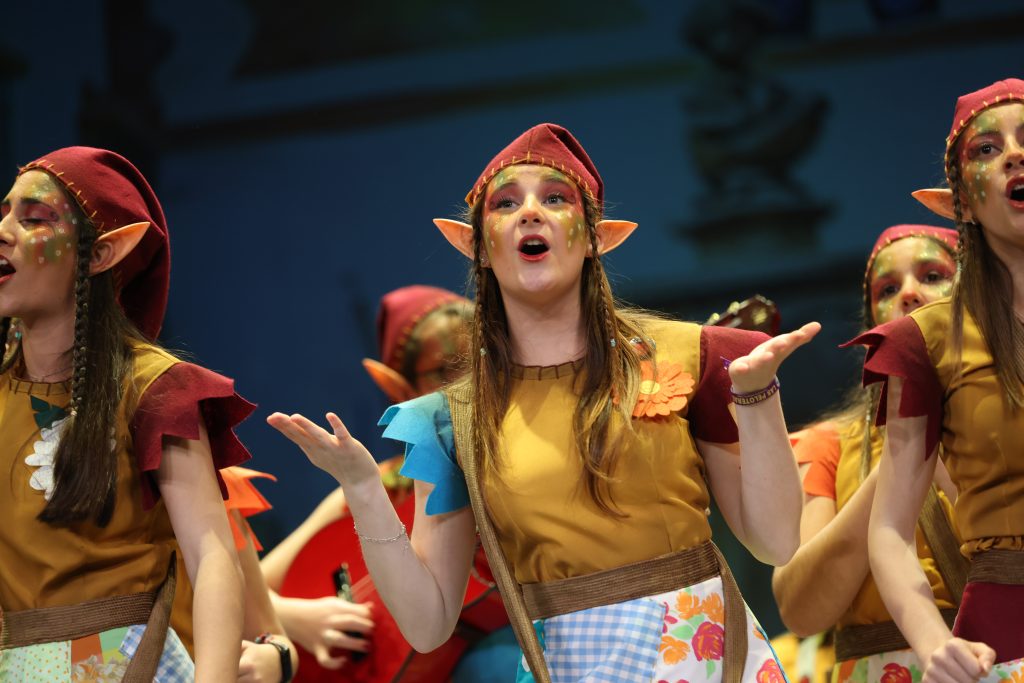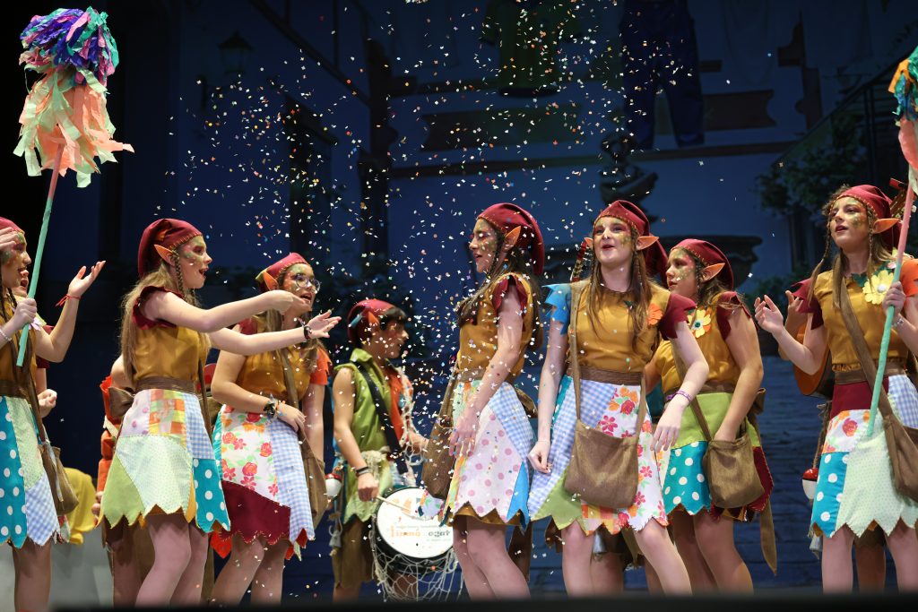 La presentación situó al público ante un grupo de duendecillos que se cuelan en una casa y descubren el carnaval casi como un juego secreto. El tipo, cuidado en los detalles, combinó delantales llenos de retales, gorros y orejitas de gnomo, además de flores que aportaban color y dinamismo al conjunto. Una estética sencilla y reconocible que reforzó el carácter travieso del personaje y ayudó a construir un ambiente cercano y coherente con la edad de las componentes.