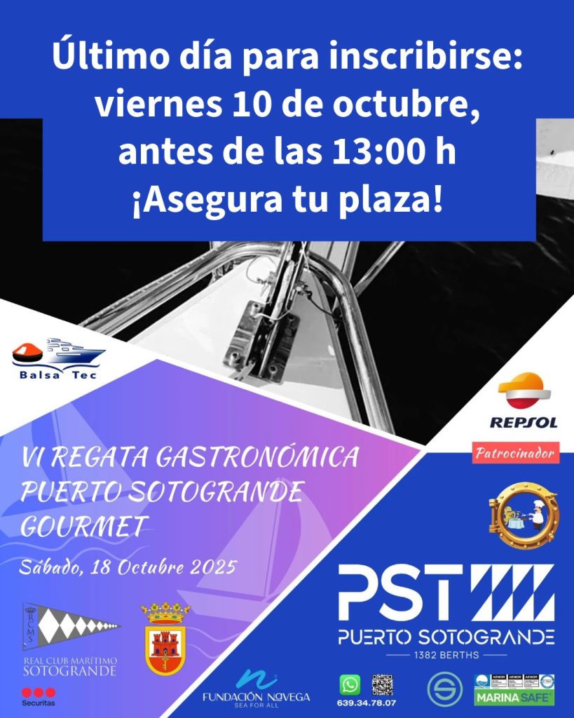 Los interesados aún pueden inscribirse hasta las 13:00 horas de este viernes, contactando con el Real Club Marítimo Sotogrande a través del correo electrónico rcms@rcms.es, del teléfono +34 648 444 930, o directamente con el Puerto Deportivo de Sotogrande.