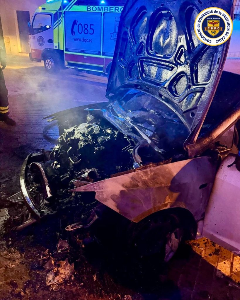 Un incendio declarado en la madrugada del viernes ha calcinado por completo un vehículo estacionado en la calle Lepanto, en Arcos de la Frontera. El servicio se activó a las 2:20 horas y motivó la salida urgente de dos vehículos de intervención y tres bomberos del parque arcense.