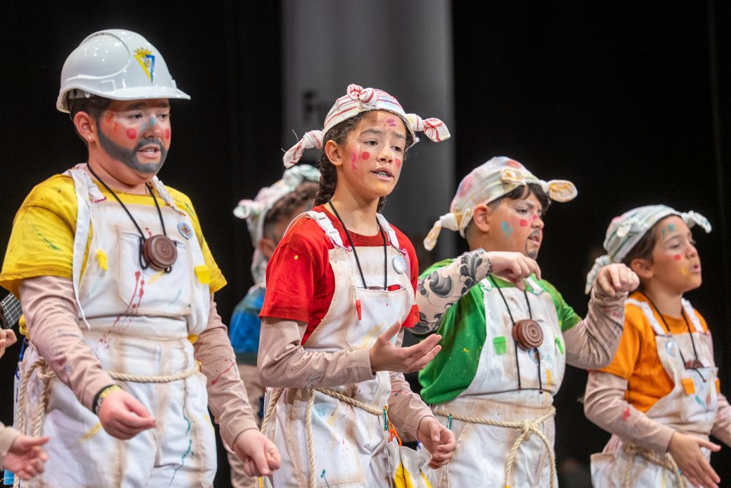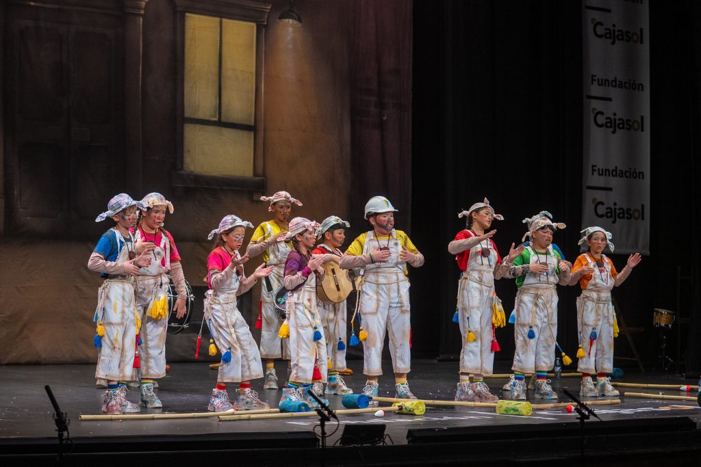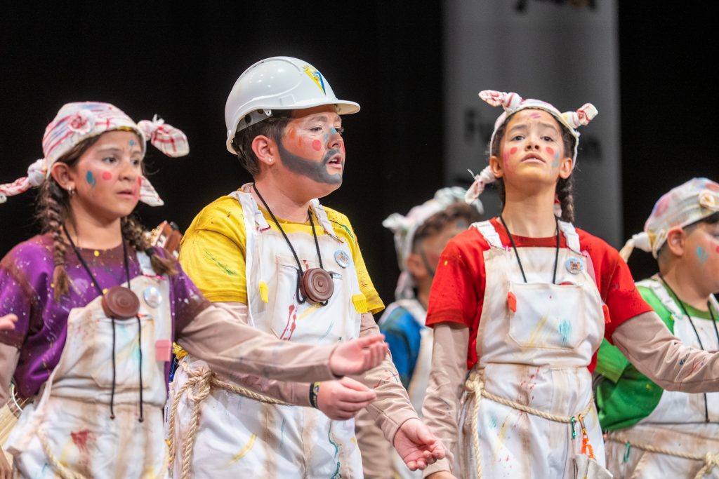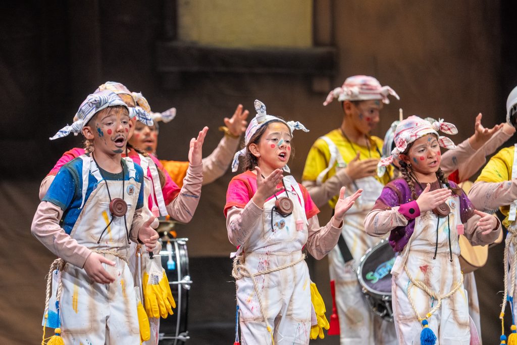 El tipo se descubrió con el telón: cuadrilla infantil de pintores de fachadas, con mono de trabajo, rodillos, cinturón de herramientas, andamios y latas de pintura. La elección permitió un guiño doble: al colorido urbano gaditano y a la identidad del Cádiz CF, subrayado mediante la paleta azul-amarilla utilizada en varios elementos del vestuario. Se evitó el humor de riesgo laboral y no se incluyeron escenas de peligro físico; la propuesta se mantuvo dentro del código carnavalesco infantil sin tensión ni exposición a situaciones inapropiadas.