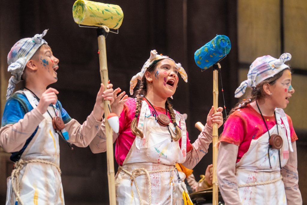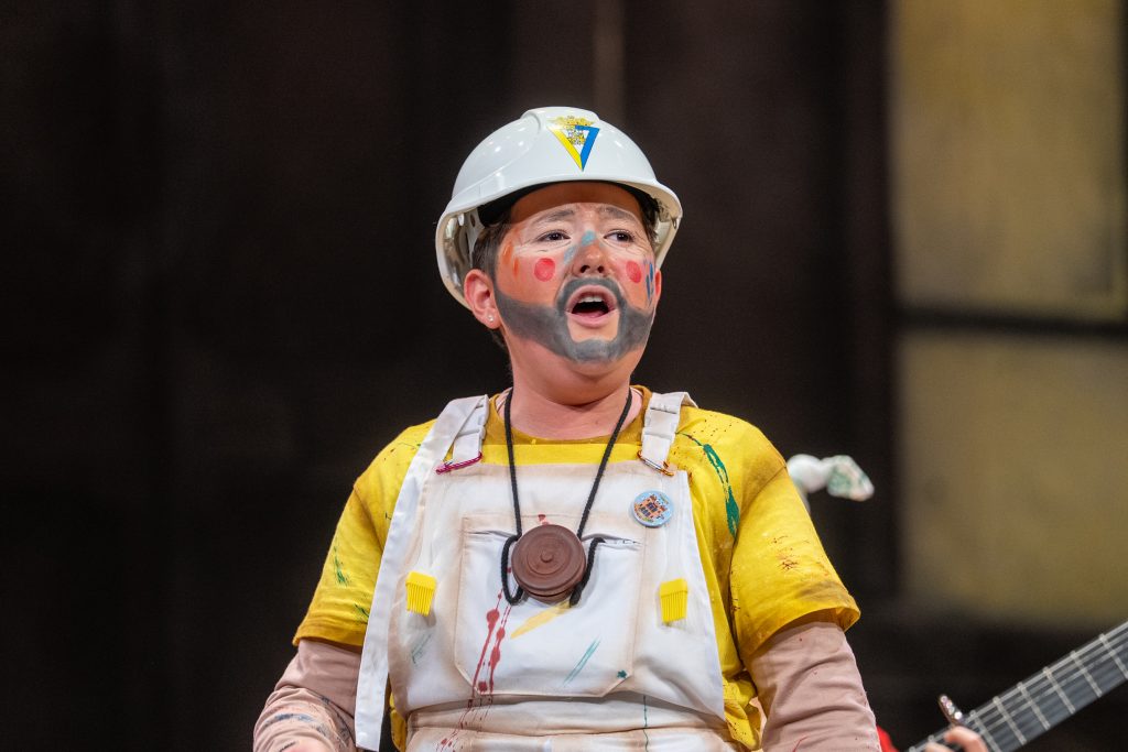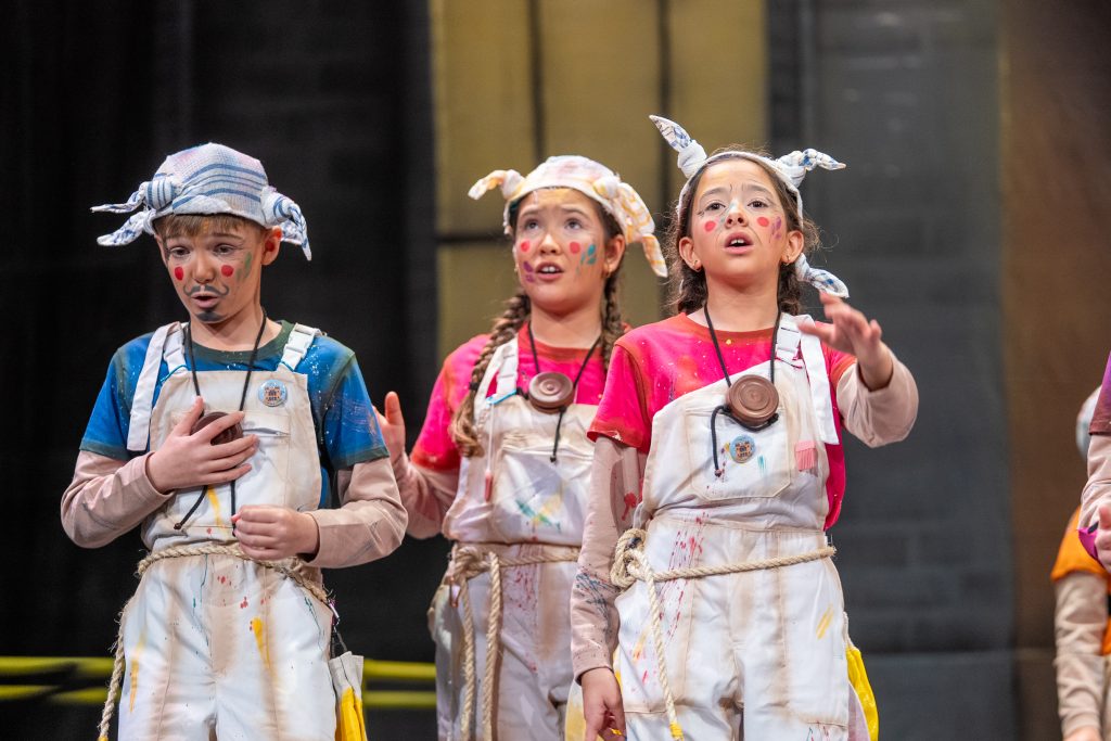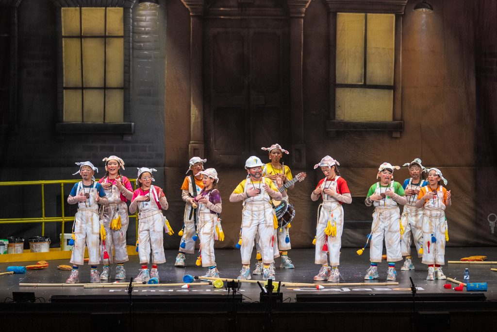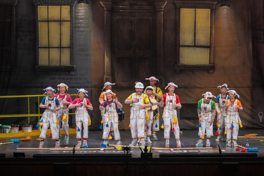 El tipo se descubrió con el telón: cuadrilla infantil de pintores de fachadas, con mono de trabajo, rodillos, cinturón de herramientas, andamios y latas de pintura. La elección permitió un guiño doble: al colorido urbano gaditano y a la identidad del Cádiz CF, subrayado mediante la paleta azul-amarilla utilizada en varios elementos del vestuario. Se evitó el humor de riesgo laboral y no se incluyeron escenas de peligro físico; la propuesta se mantuvo dentro del código carnavalesco infantil sin tensión ni exposición a situaciones inapropiadas.